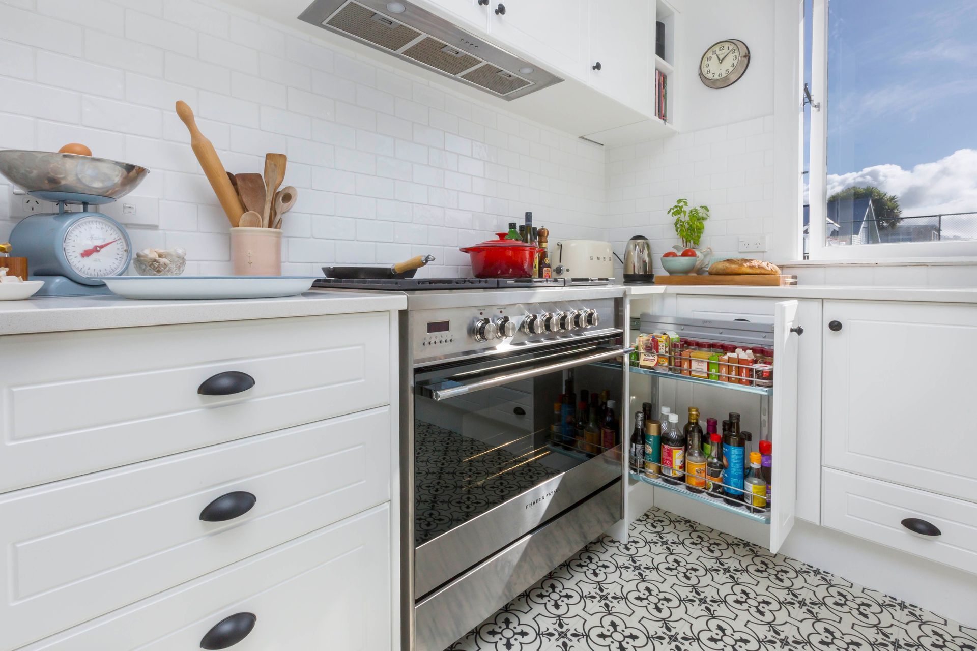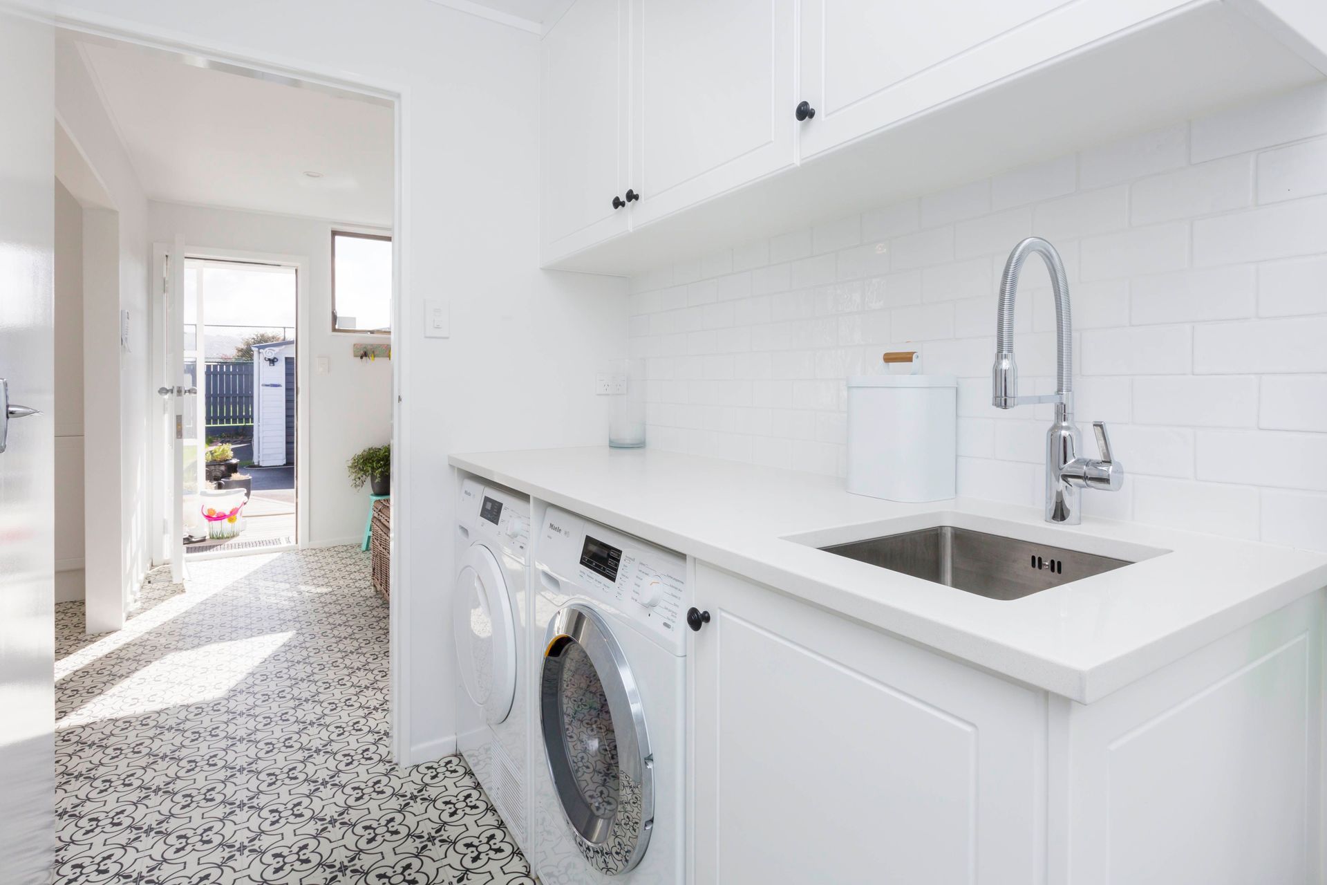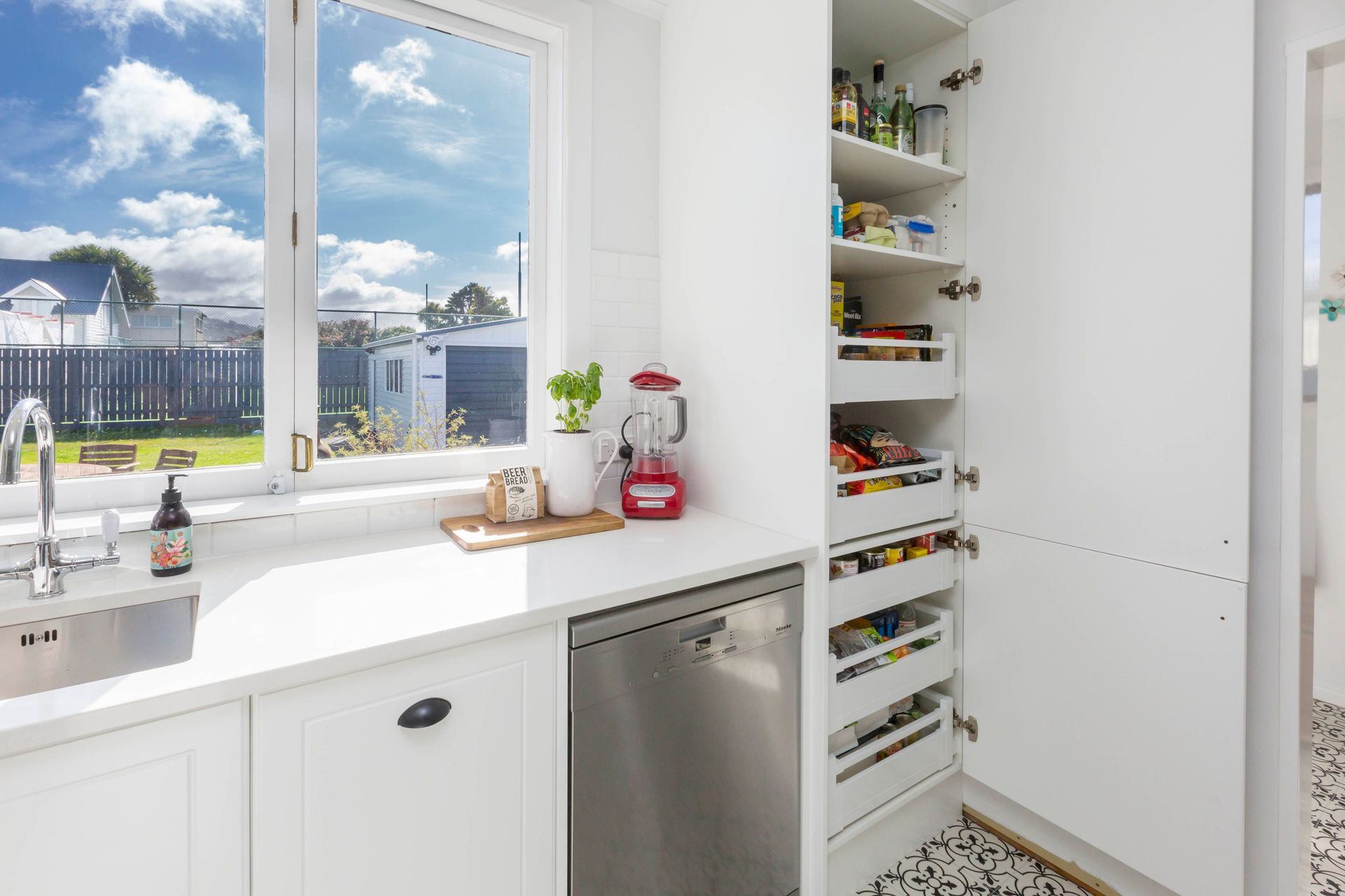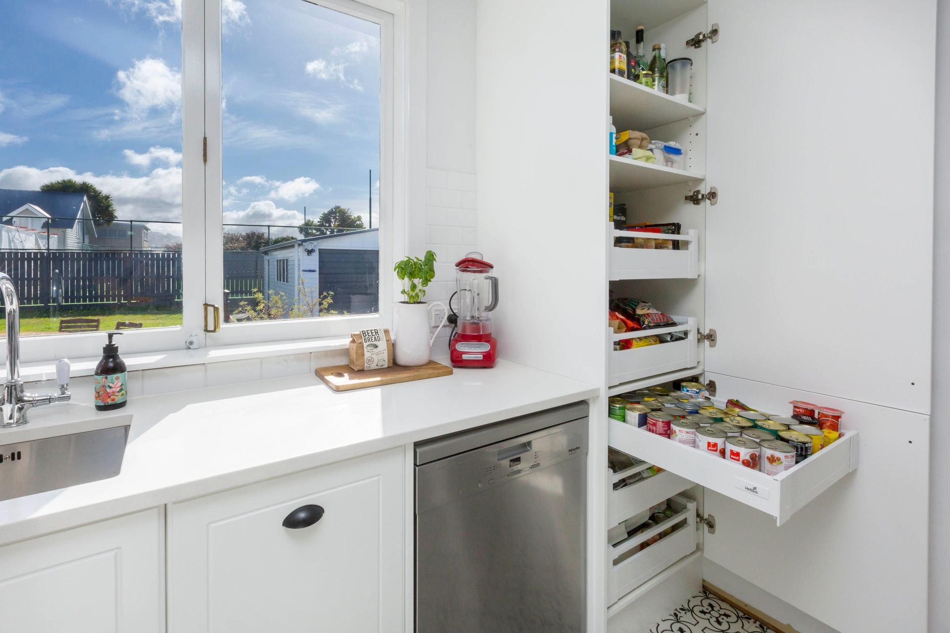 ArchiPro Project Summary - A vibrant kitchen featuring lacquer finished doors and black handles, harmoniously complemented by stunning flooring, creating a warm and inviting atmosphere in the heart of the Petone home.