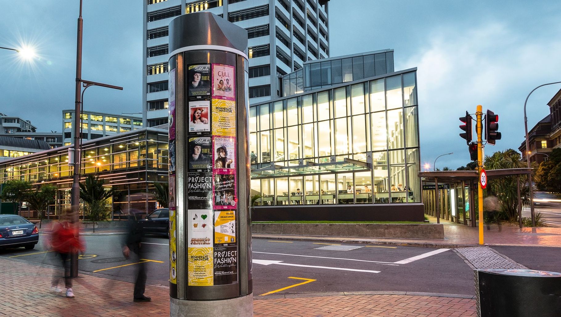 ArchiPro Project Summary - Innovative street poster columns for Phantom Billstickers, featuring emergency supply storage, earthquake-proof design, and solar-powered LED lighting, enhancing urban aesthetics and functionality in Wellington and Hamilton.