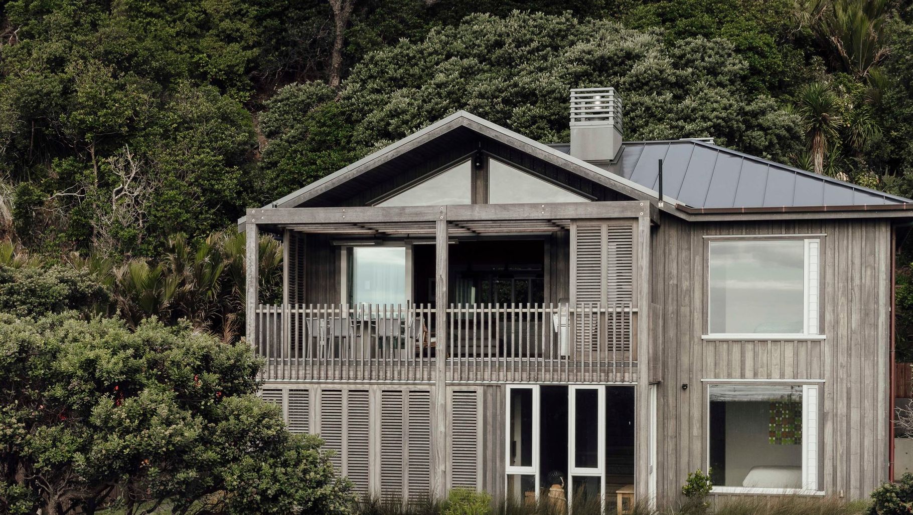 ArchiPro Project Summary - The Piha House is a modern cottage that blends design with nature, featuring grey siding and a striking roof, emphasizing sustainability and comfort.