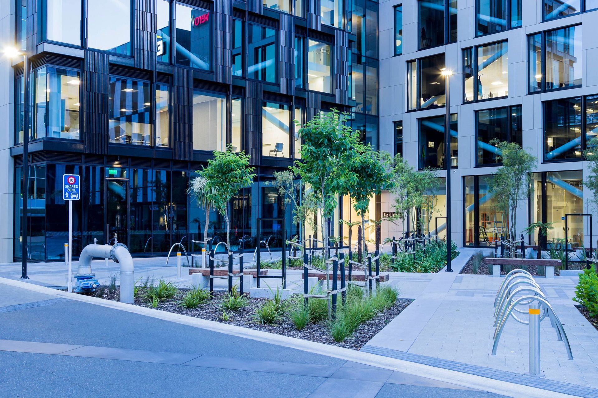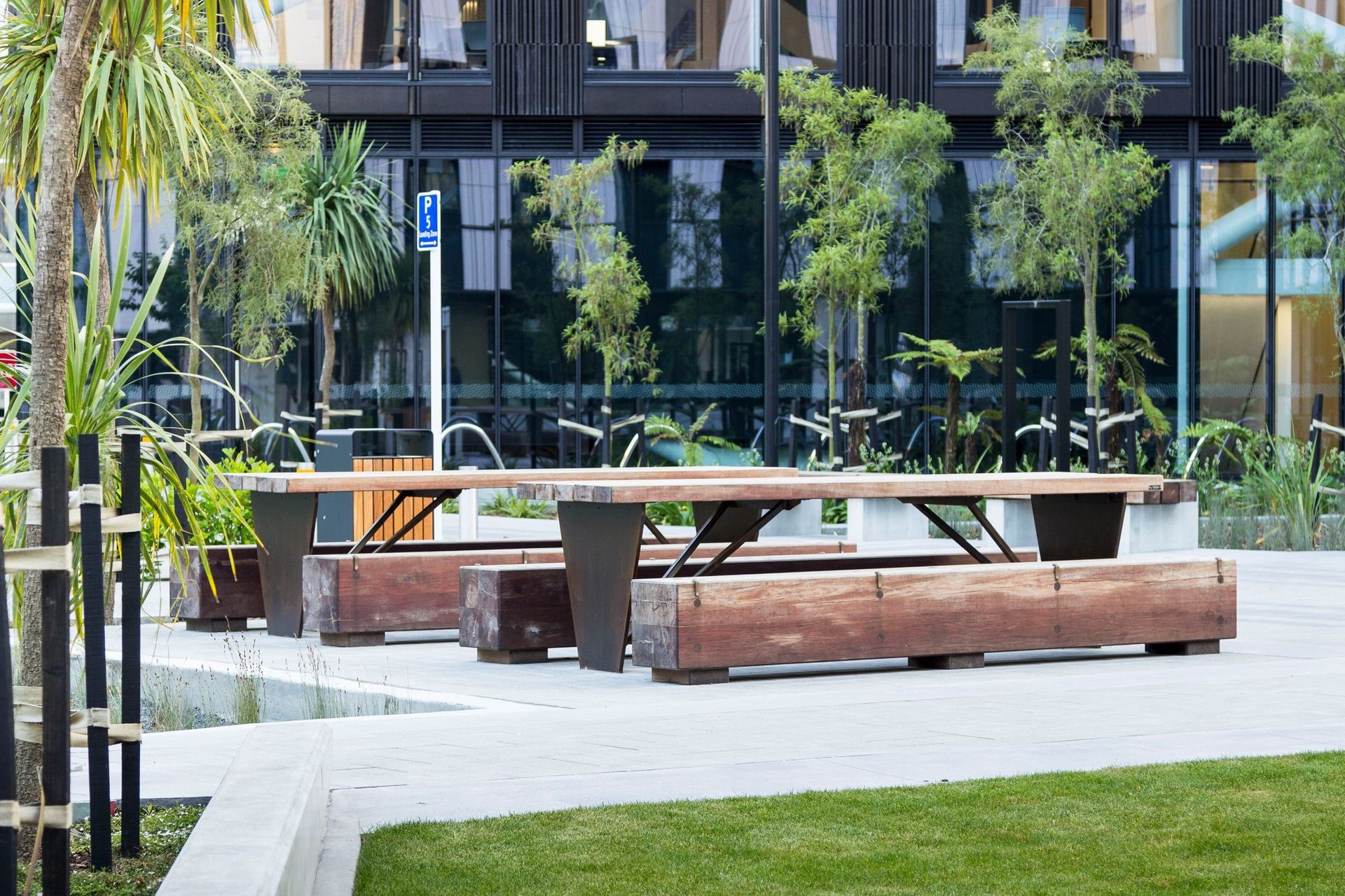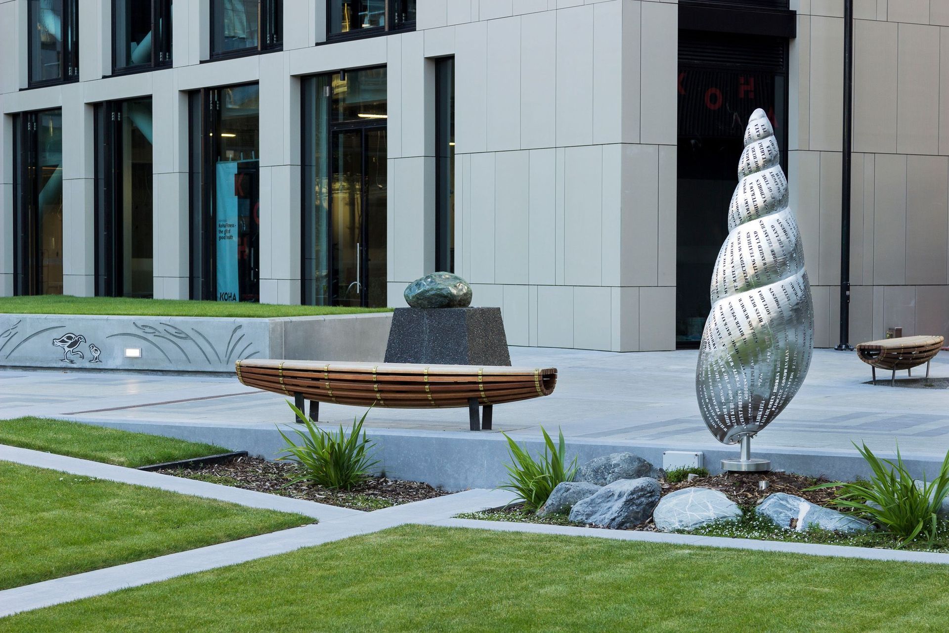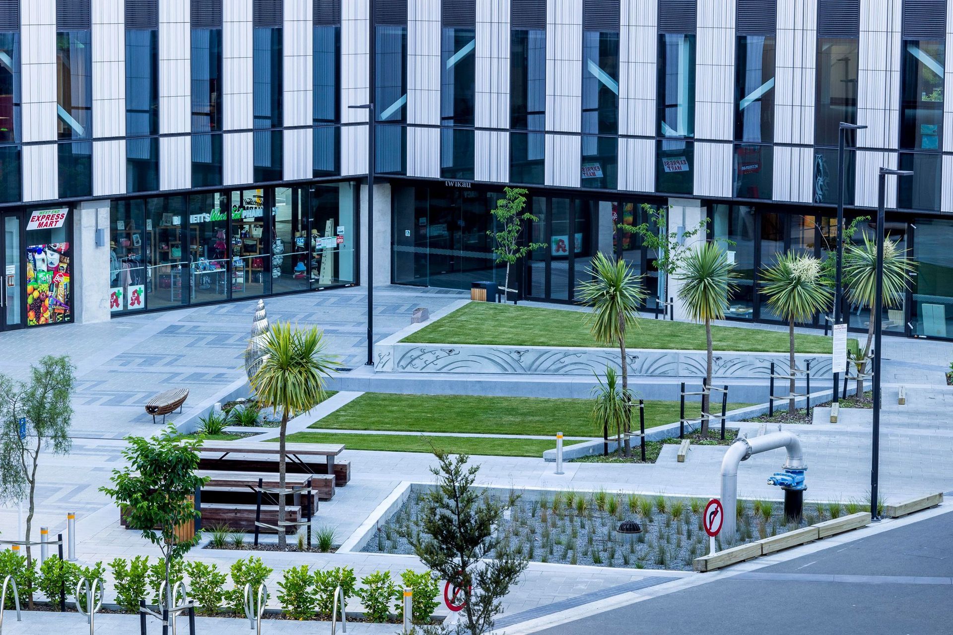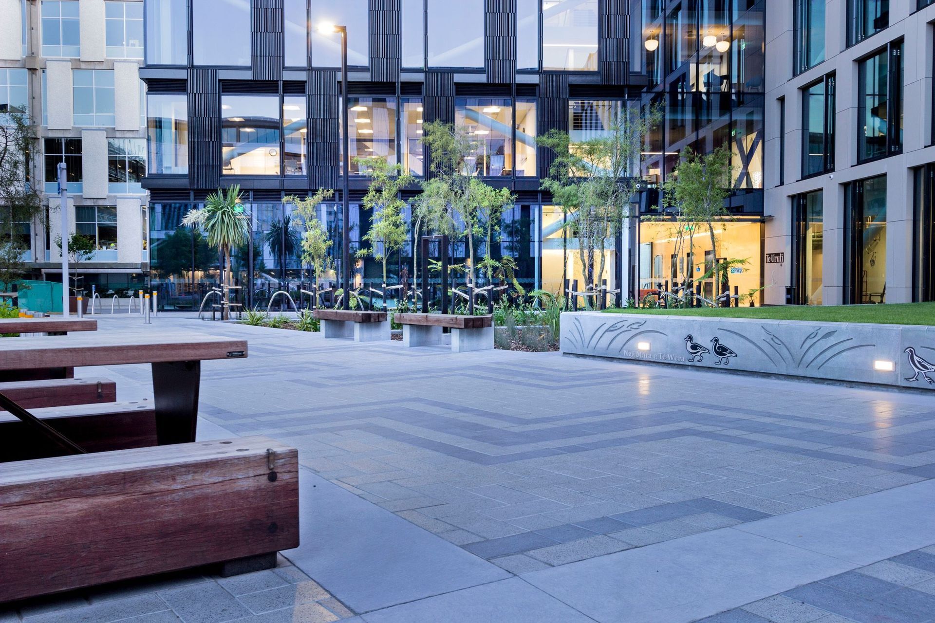 ArchiPro Project Summary - King Edward Barracks: A collaborative urban park design reflecting Ngāi Tahu values and history, featuring integrated artwork, elegant furnishings, and a sun-oriented layout for community engagement.