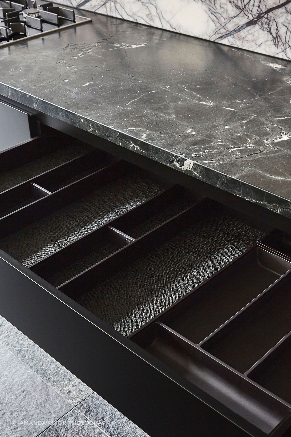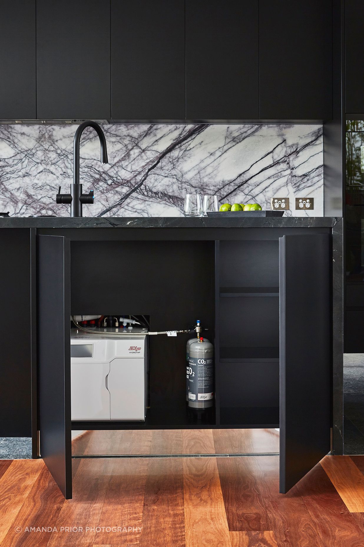 ArchiPro Project Summary - A stylish kitchen featuring black cabinetry and striking New York marble splashback, complemented by a functional study/craft area for children with ample storage and charging capabilities.