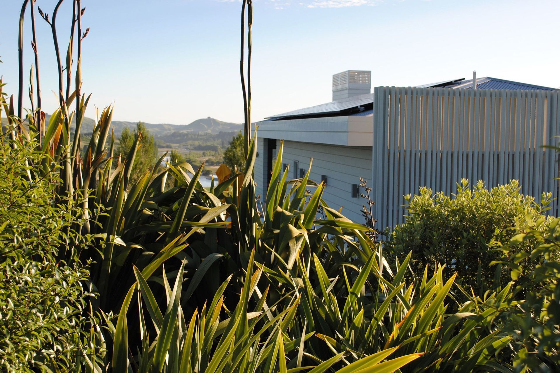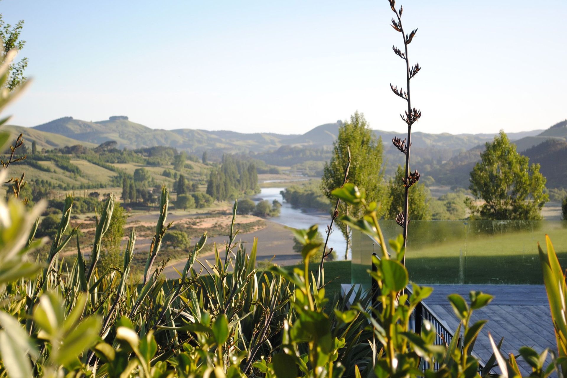 ArchiPro Project Summary - A harmonious landscape design that enhances the striking facade of Poplars in Tuki Tuki Valley, featuring native plantings, expansive lawns, and a sunken courtyard with Jacaranda trees, seamlessly integrating the home with its stunning natural surroundings.
