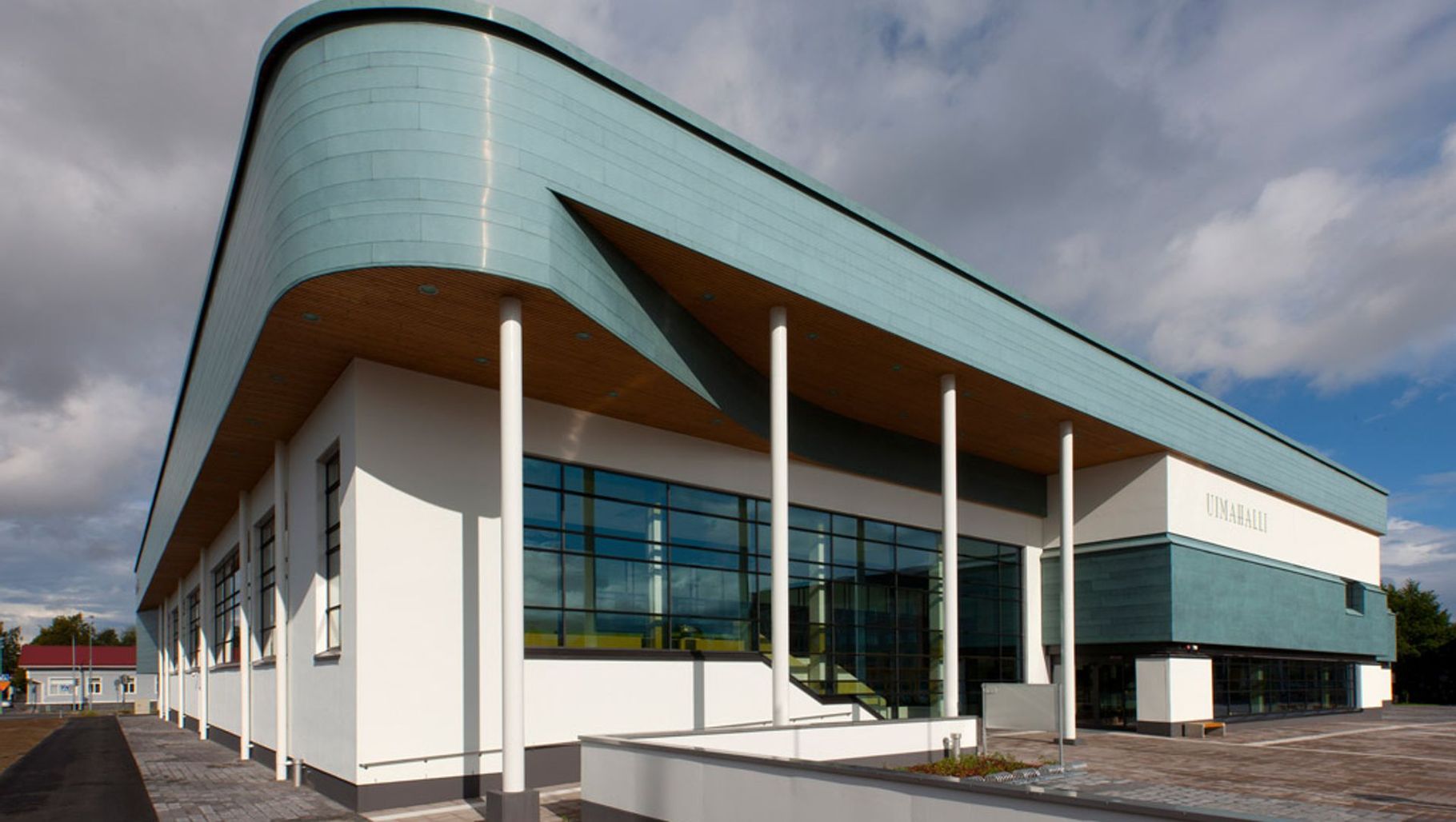 ArchiPro Project Summary - Innovative Pori Swimming Hall featuring prepatinated copper facades and an integrated solar thermal system, providing sustainable heating solutions and maintaining optimal water temperatures year-round.