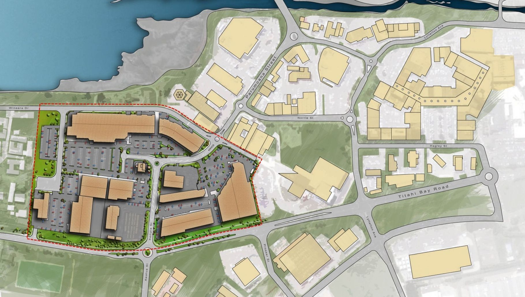 ArchiPro Project Summary - A pioneering large-format retail development in Porirua, combining eleven sites to create a mega centre featuring 23 superstores and over 65,000 square metres of retail space, addressing the growing demand for bulk retail in the Wellington Region.