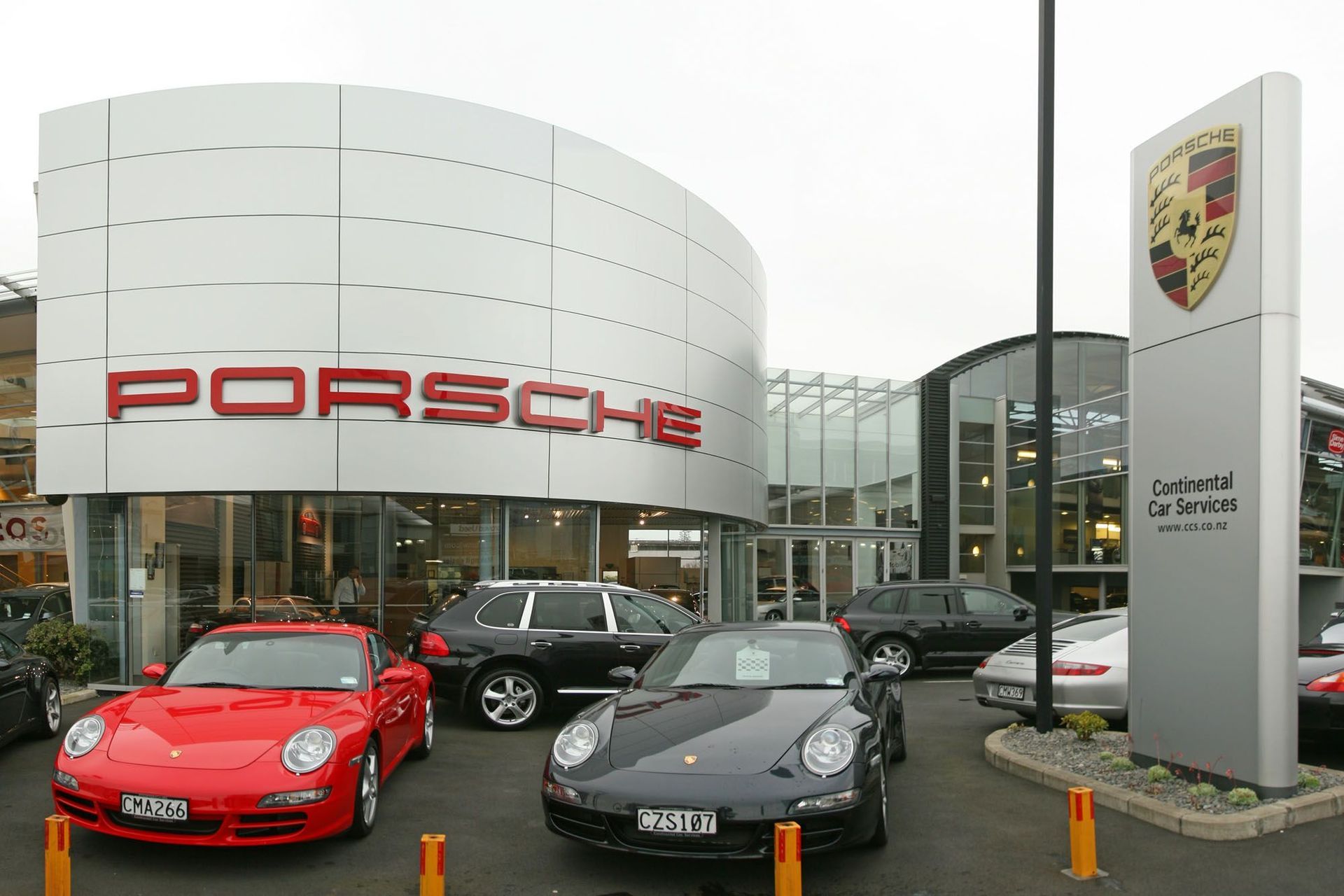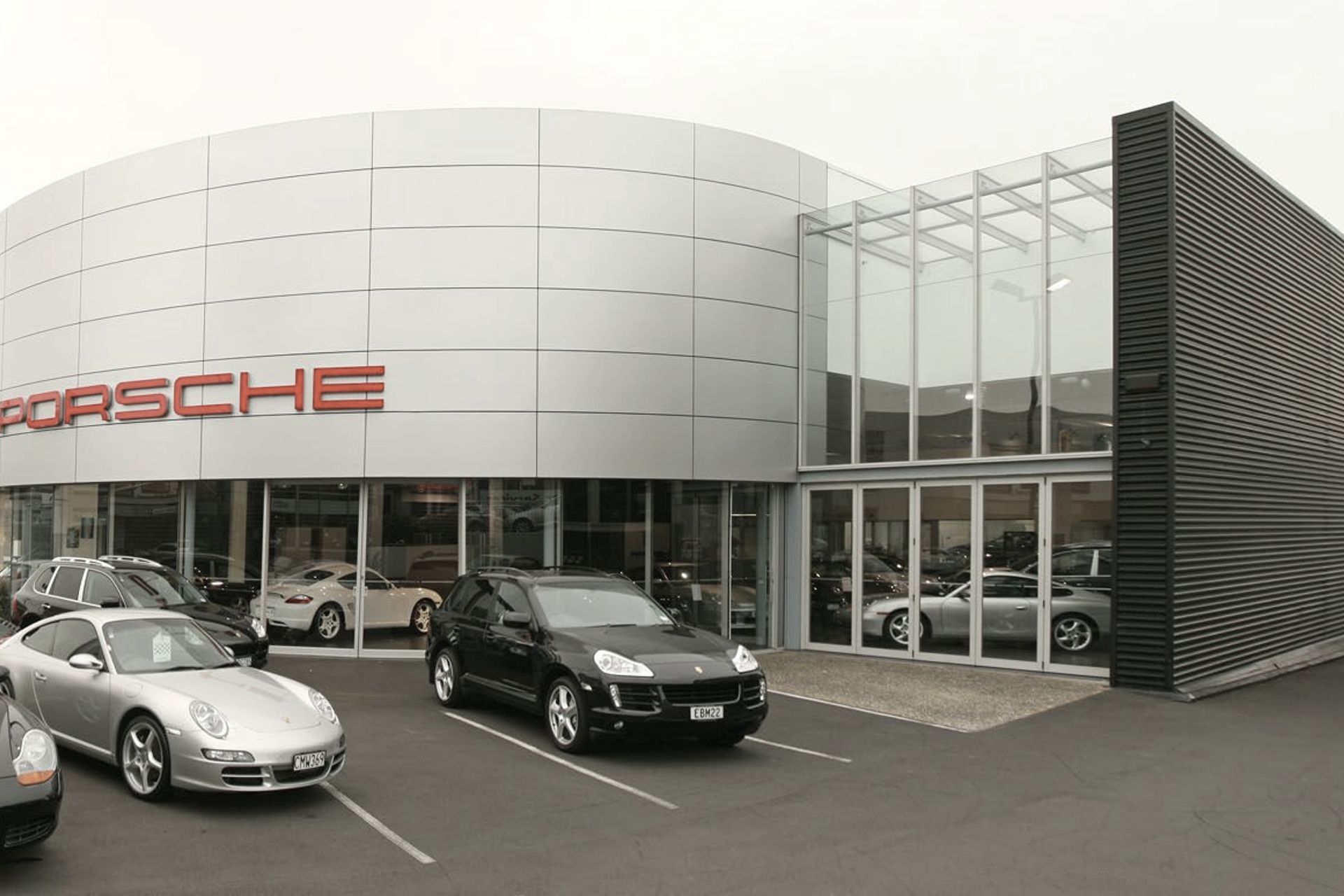 ArchiPro Project Summary - Porsche Showroom completed in November 2002, featuring a visually harmonious design with a curved façade, showcasing an ultra-clean workshop visible from the showroom, reflecting the brand's commitment to quality and customer experience.