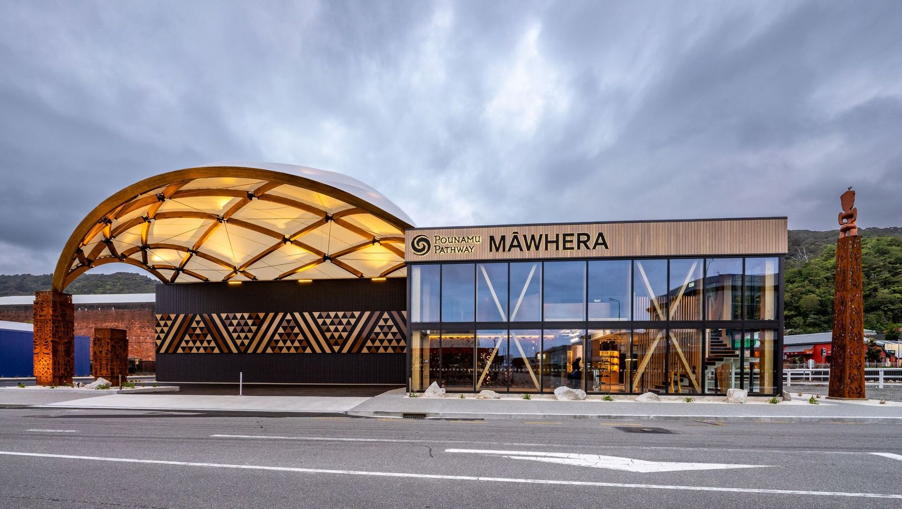 ArchiPro Project Summary - Pounamu Pathway Māwhera celebrates the heritage of Poutini Ngāi Tahu through a mass timber structure, featuring a protective canopy, local iwi symbols, and an interactive experience by Weta Workshop, creating a profound cultural and ecological landmark.
