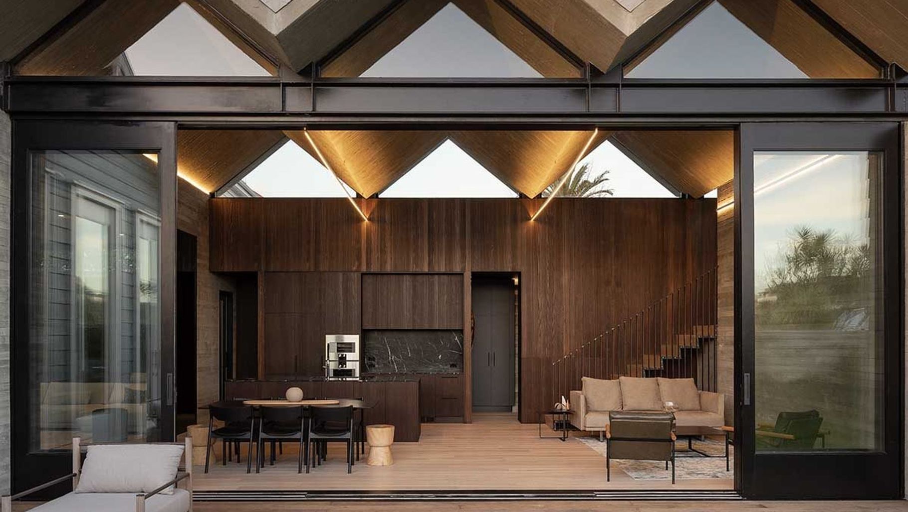 ArchiPro Project Summary - Poured Pleats Home: A collaboration between Jack McKinney Architects and the Ireland family, showcasing exquisite European Larch veneers and innovative design, set to impress after their previous success with the award-winning Diagrid House.