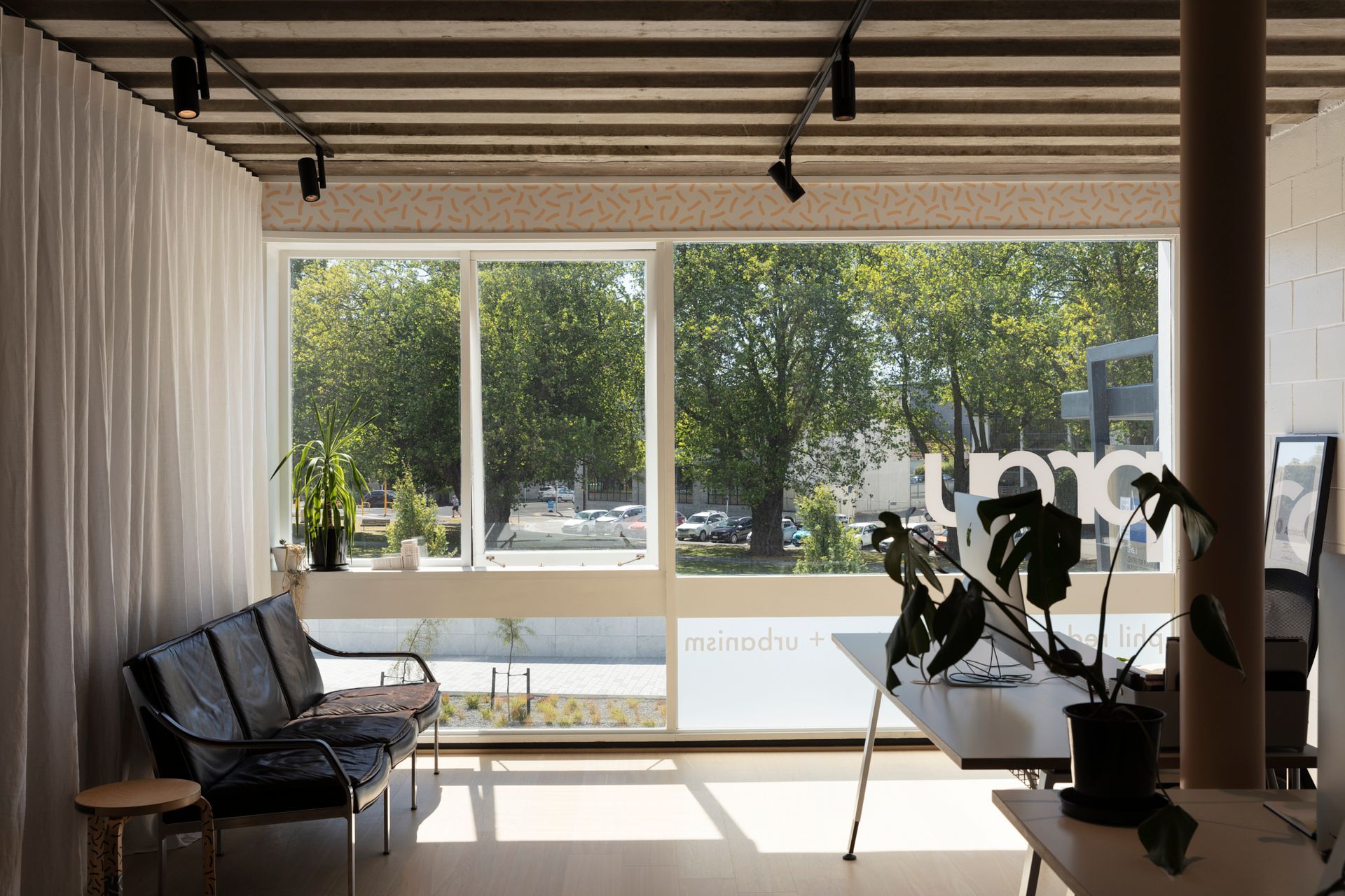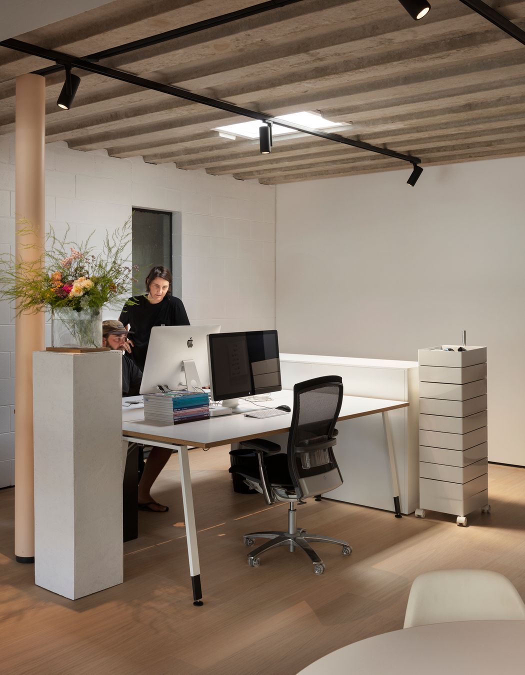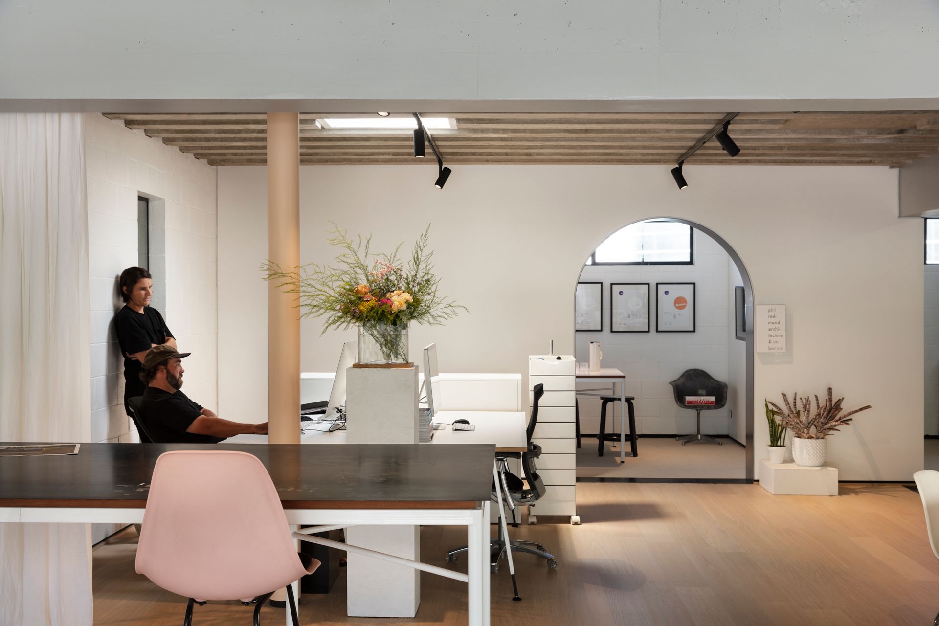ArchiPro Project Summary - PRAU studio at Poynton House, Christchurch, revitalizes a 1970s structure by embracing its original concrete aesthetics, enhancing collaborative workspaces with modern design elements, and integrating vibrant accents inspired by the Memphis Group.