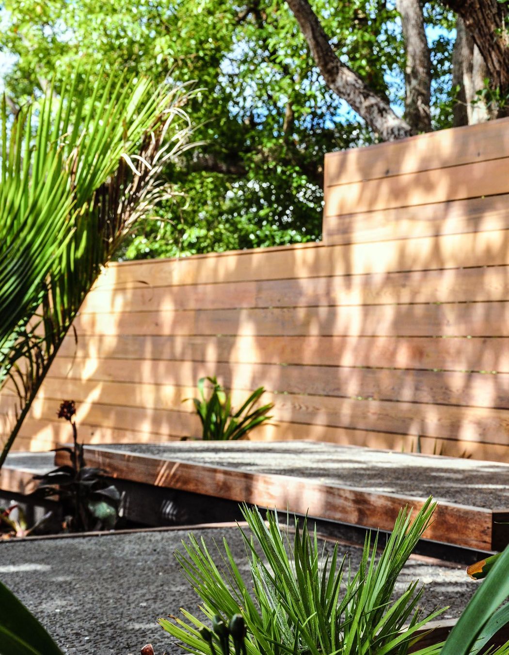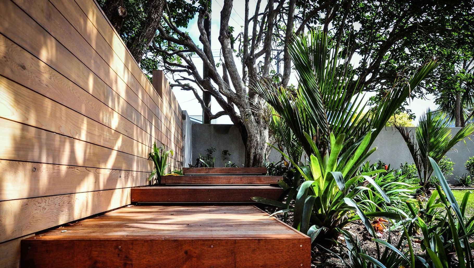 ArchiPro Project Summary - A contemporary garden design harmoniously integrating with protected native trees, featuring a floating entry path and lush sub-tropical planting in Northcote Point, Auckland.