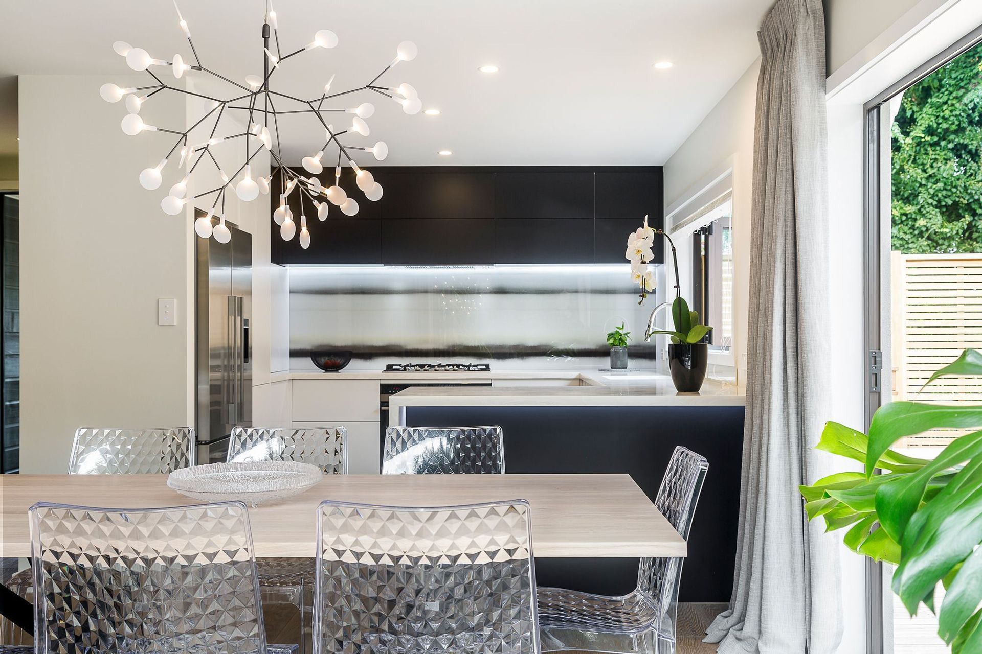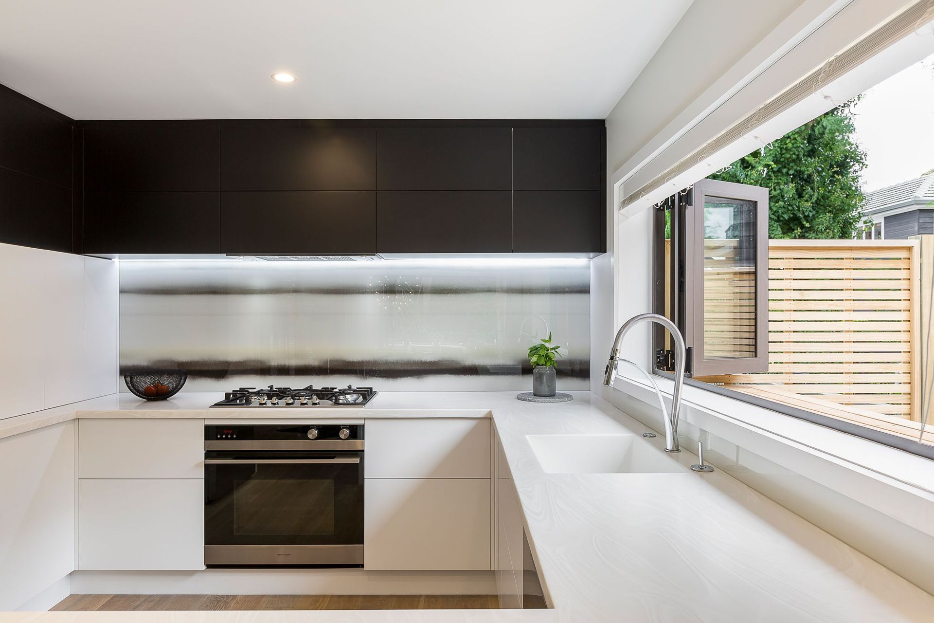 ArchiPro Project Summary - A harmonious blend of white and black cabinetry complemented by a natural timber floor, featuring a linear printed glass splashback that unifies the kitchen's design while adding an organic touch for timeless elegance.