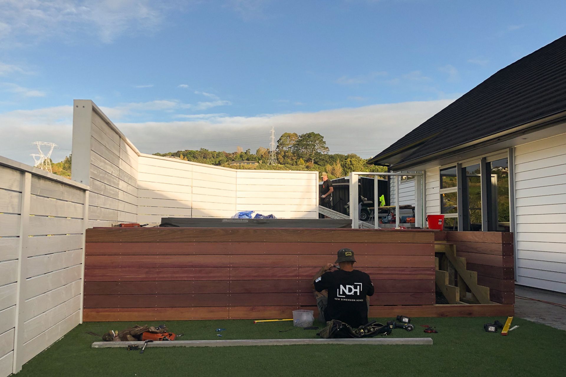 ArchiPro Project Summary - Private outdoor living space featuring a perimeter fence, spa pool deck with glass balustrade, and a golf putting green, designed for privacy and low maintenance, completed in 6 weeks for New Zealand sports star Joseph Parker.