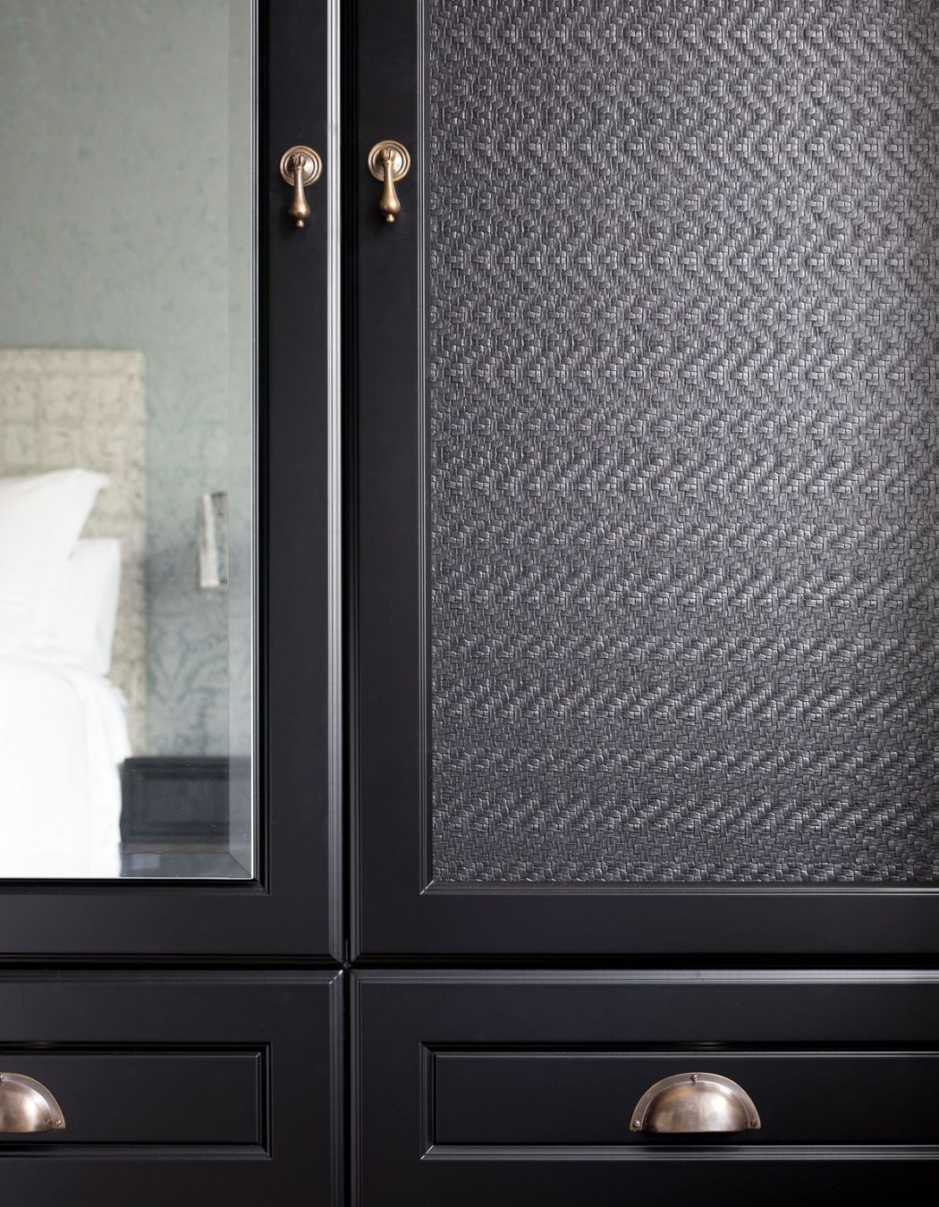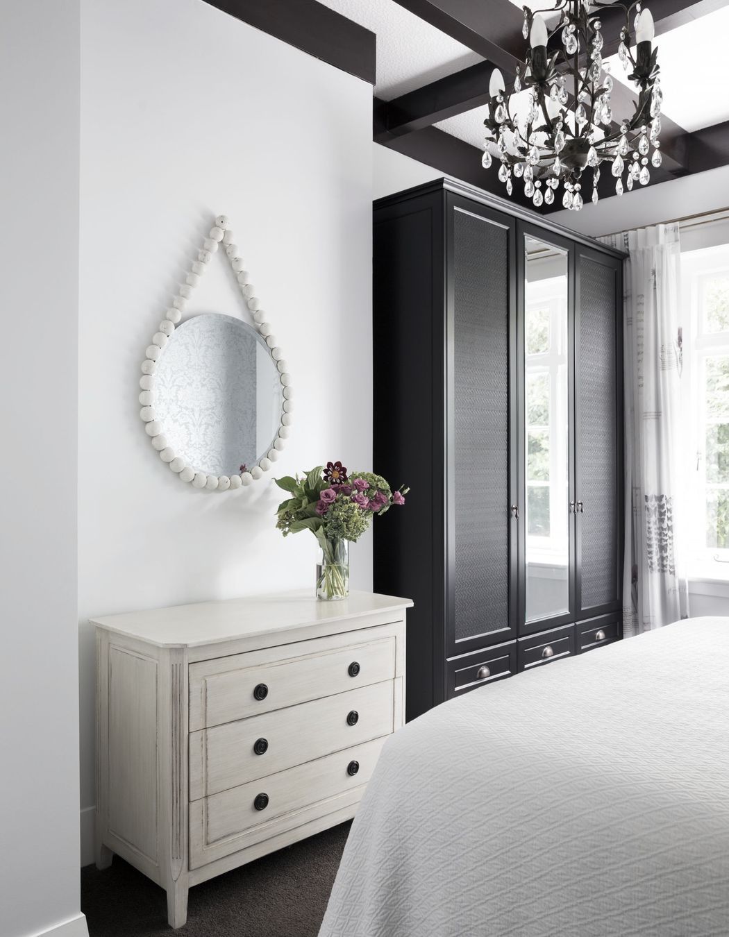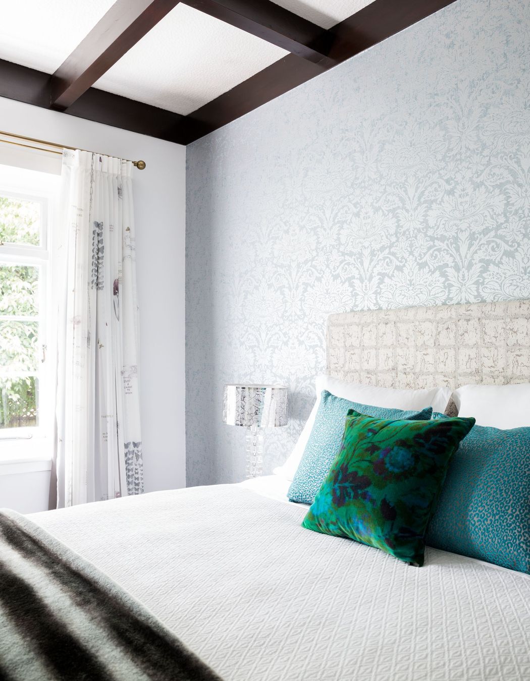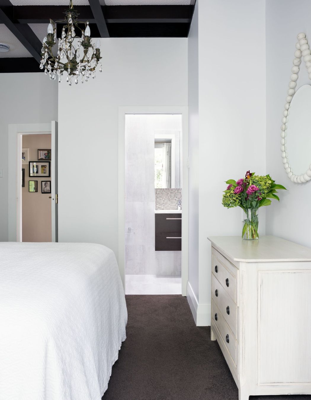 ArchiPro Project Summary - A serene bedroom design featuring a soft colour palette, silvery grey wallpaper, and custom furnishings, complemented by an en suite with elegant wall tiles and mosaic accents.