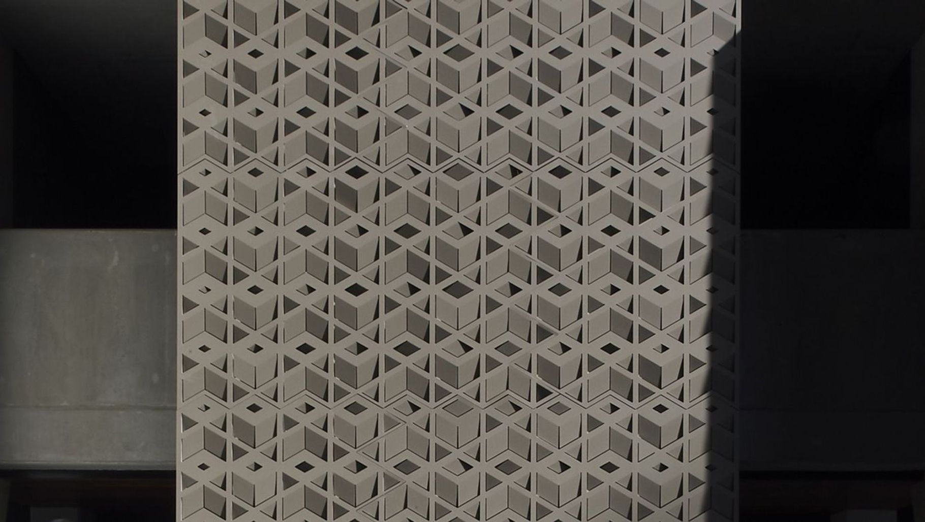 ArchiPro Project Summary - Collaboration with artist Geoff Nees to create two unique public artwork screens for a new apartment development on Queens Rd, featuring illuminated metal panels and geometric designs inspired by the site's history as Atari's former office.