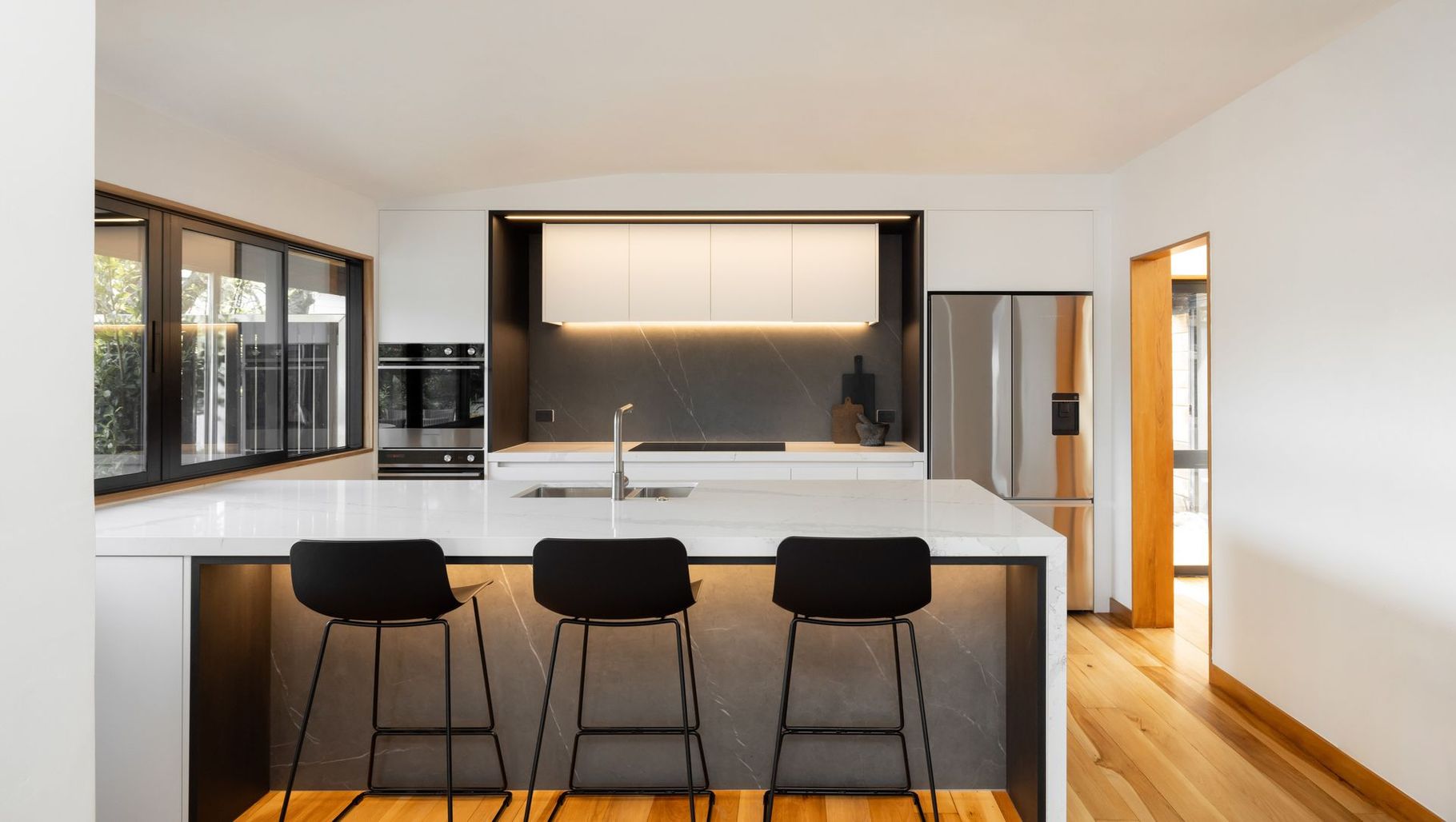 ArchiPro Project Summary - A stunning kitchen renovation in Beach Haven, featuring a spacious dining area with breathtaking water views, modern finishes, and a functional scullery designed for optimal storage and natural light.