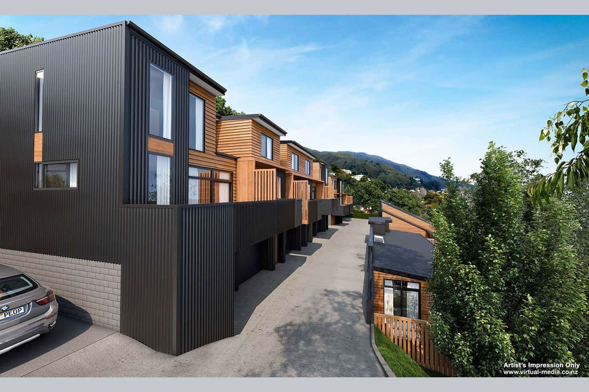 ArchiPro Project Summary - Raroa Terrace Townhouses: A thoughtfully designed development of 14 three-bedroom townhouses in Tawa, Wellington, expertly navigating the site's topographical challenges to provide ample sunlight and a welcoming community for diverse residents.