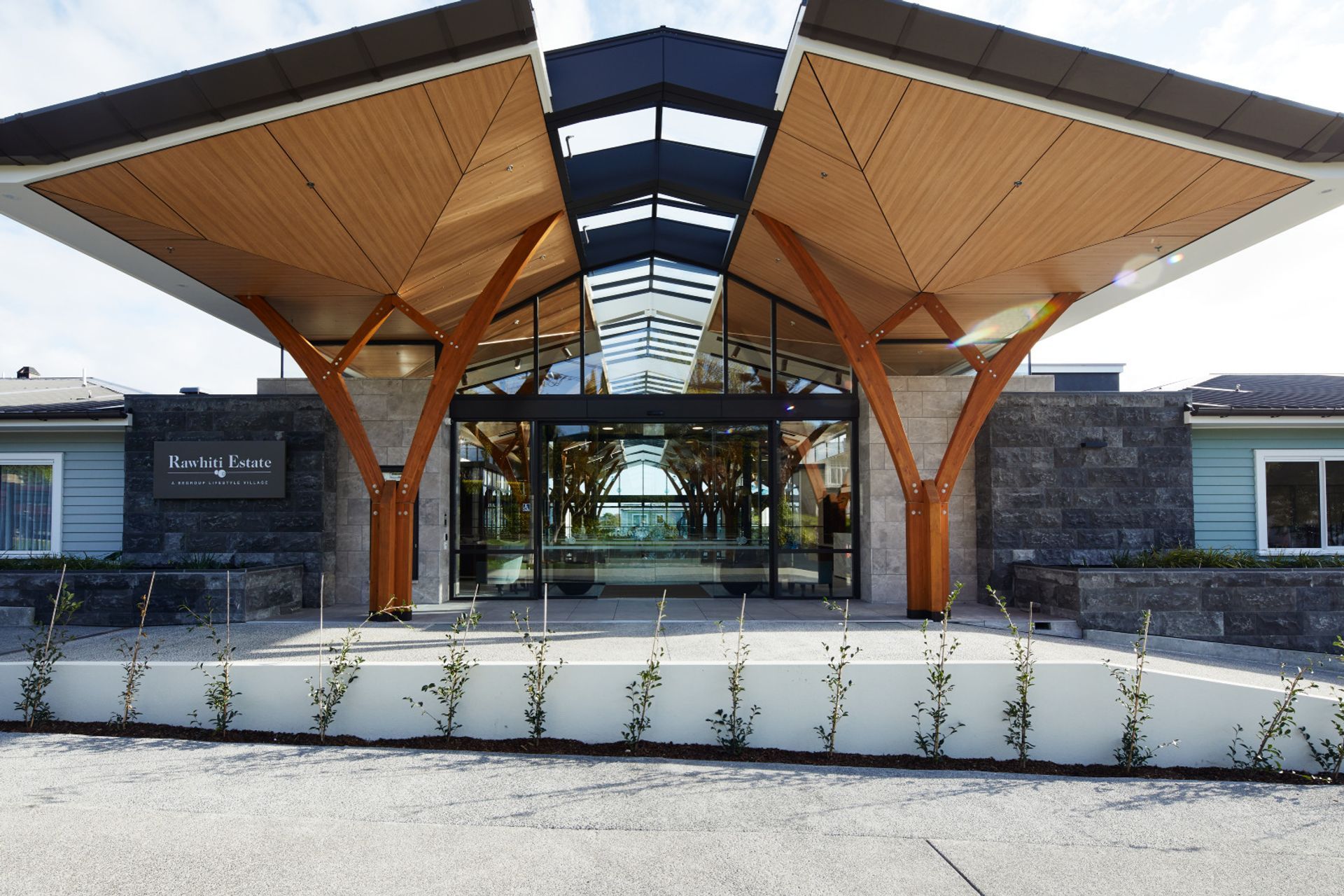 ArchiPro Project Summary - Rawhiti Estate features a stunning entrance designed by Ministry of Architecture + Interiors, showcasing Trespa Meteon soffits in Elegant Oak Satin finish, complemented by Décortech Tasmanian Ash Veneered Multigroove panels for a seamless interior flow.
