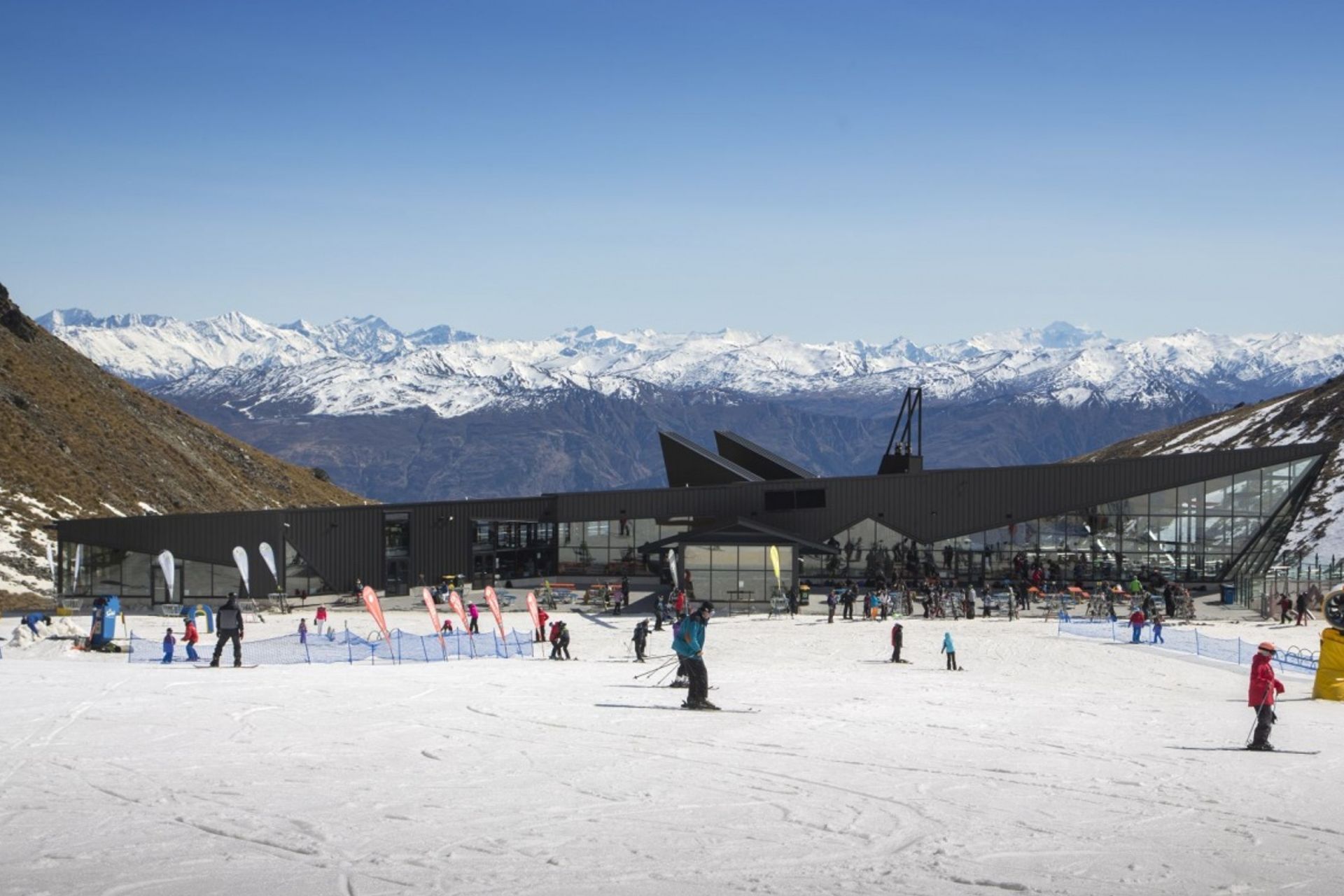 ArchiPro Project Summary - Remarkables Ski Field Base Building designed for efficient visitor flow, featuring a striking dark exterior reminiscent of a rock outcrop, with functional spaces for equipment rental, dining, and back-of-house operations, complemented by award-winning architectural elements.