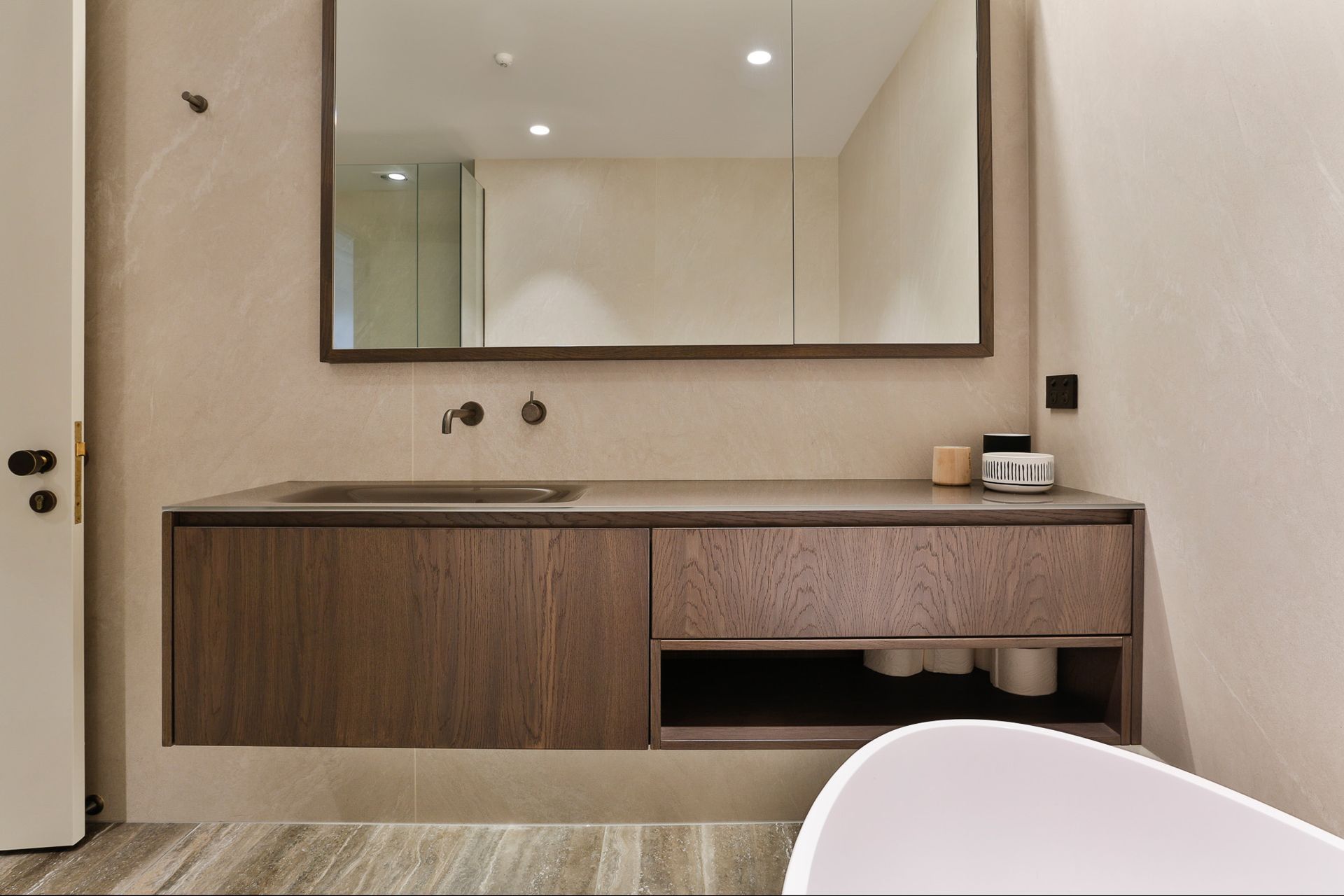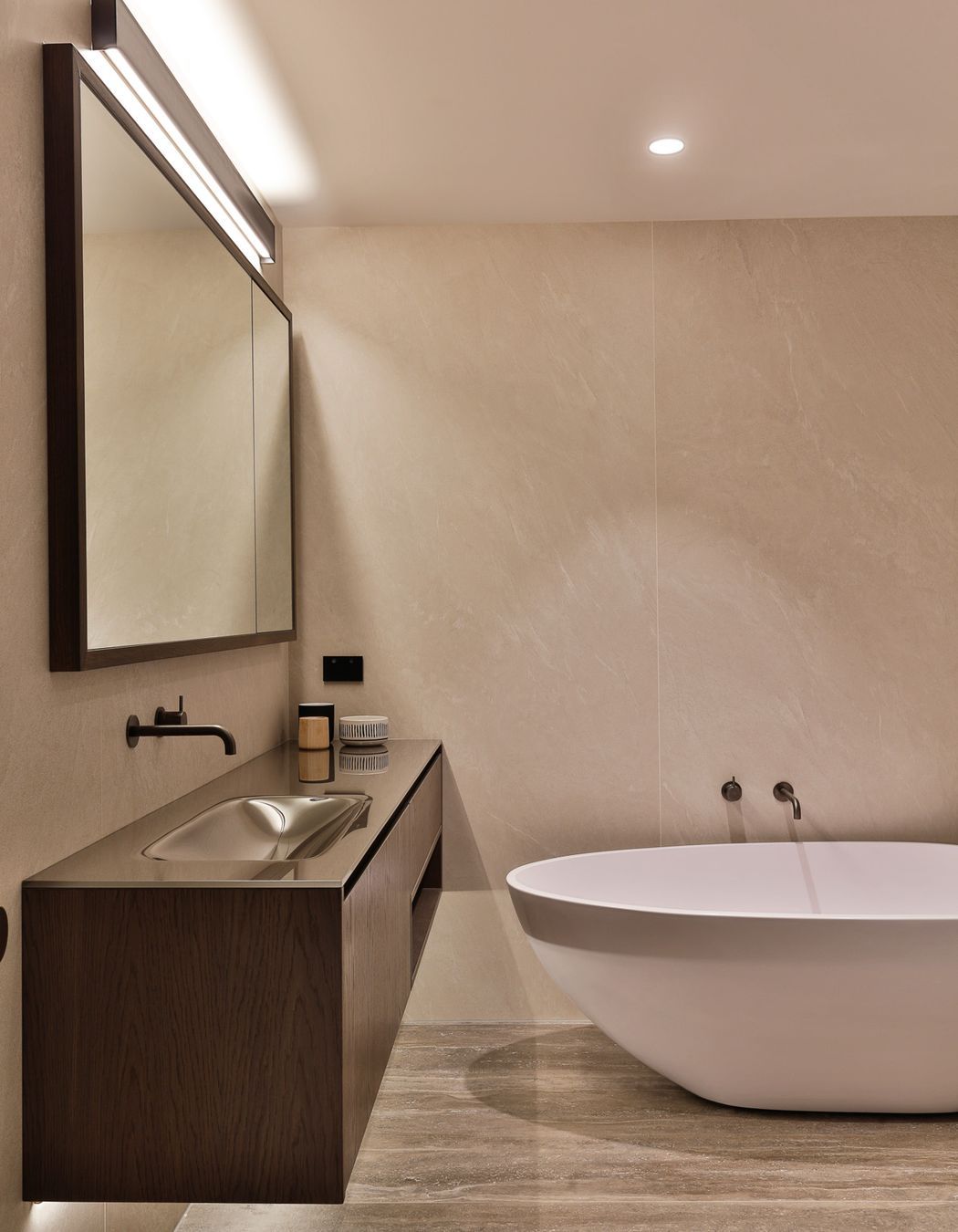 ArchiPro Project Summary - A compact yet luxurious bathroom transformation featuring a mink-coloured glass vanity, a spacious shower, a bidet toilet, and a freestanding bathtub, all designed to maximize space and enhance functionality in a stylish manner.