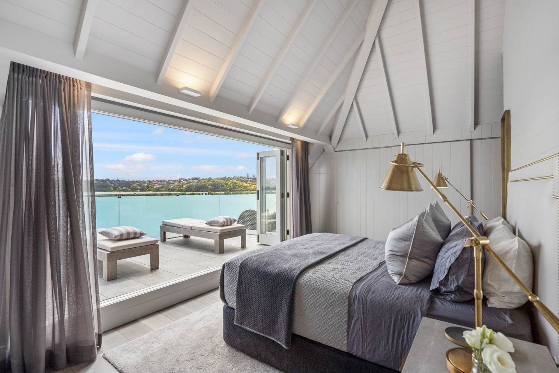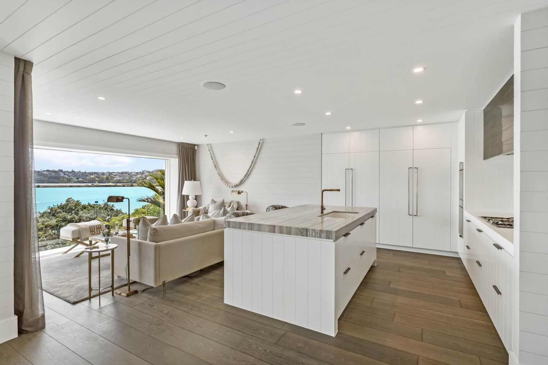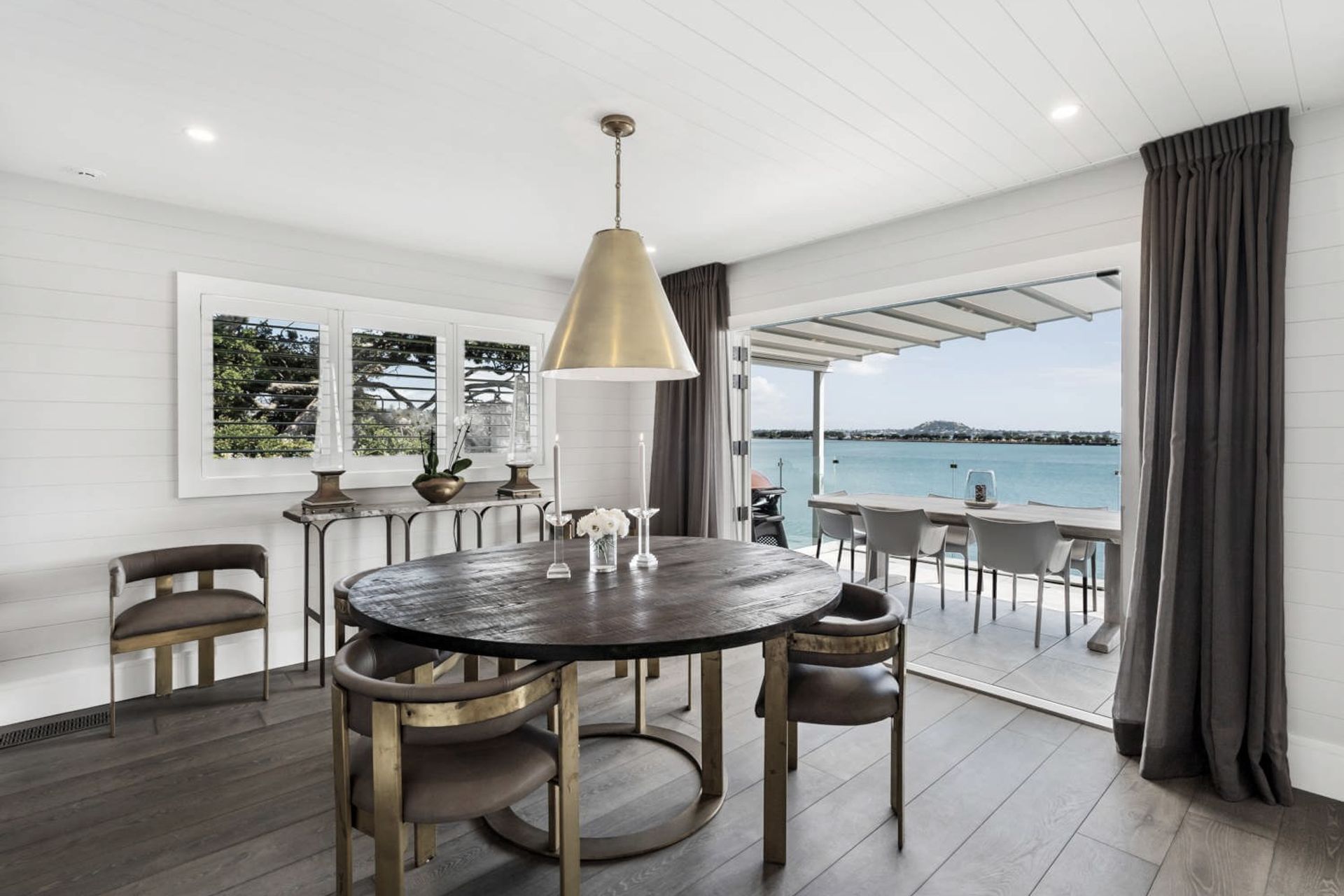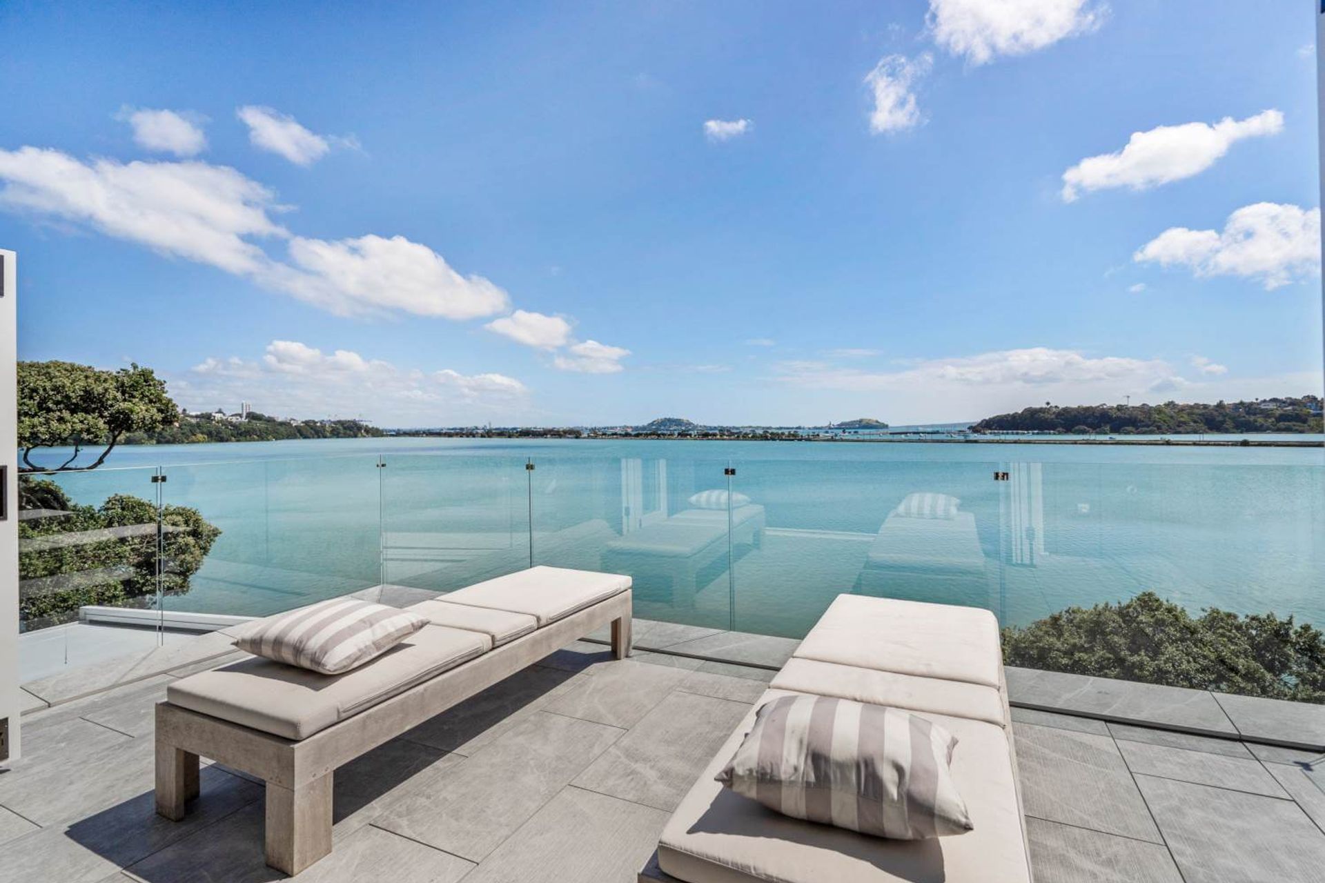 ArchiPro Project Summary - Custom joinery designed to enhance breathtaking views of Hobson Bay, featuring perfectly aligned internal elements and innovative external solutions that fold and slide away for unobstructed vistas.
