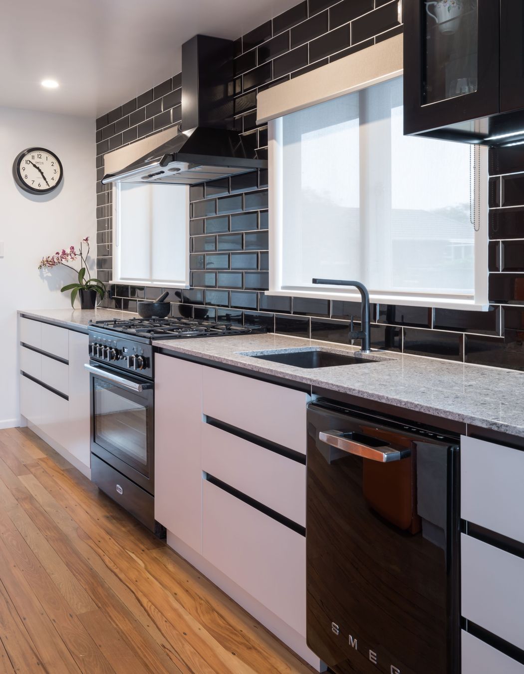 ArchiPro Project Summary - A vibrant and functional kitchen designed for a busy family of eight, featuring bold geometric cabinetry and a striking orange Smeg fridge, completed in 2017.