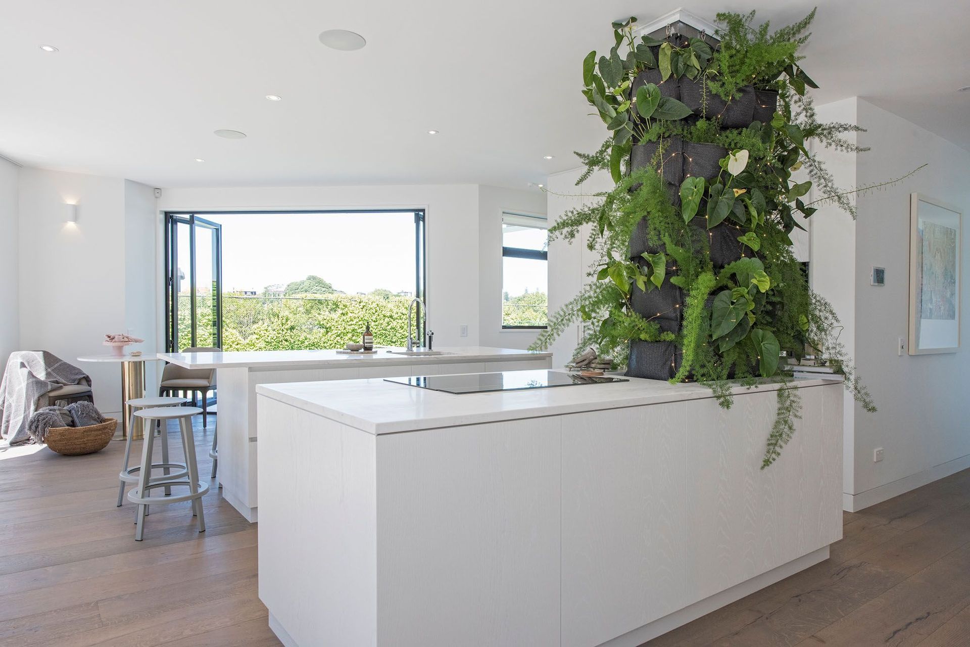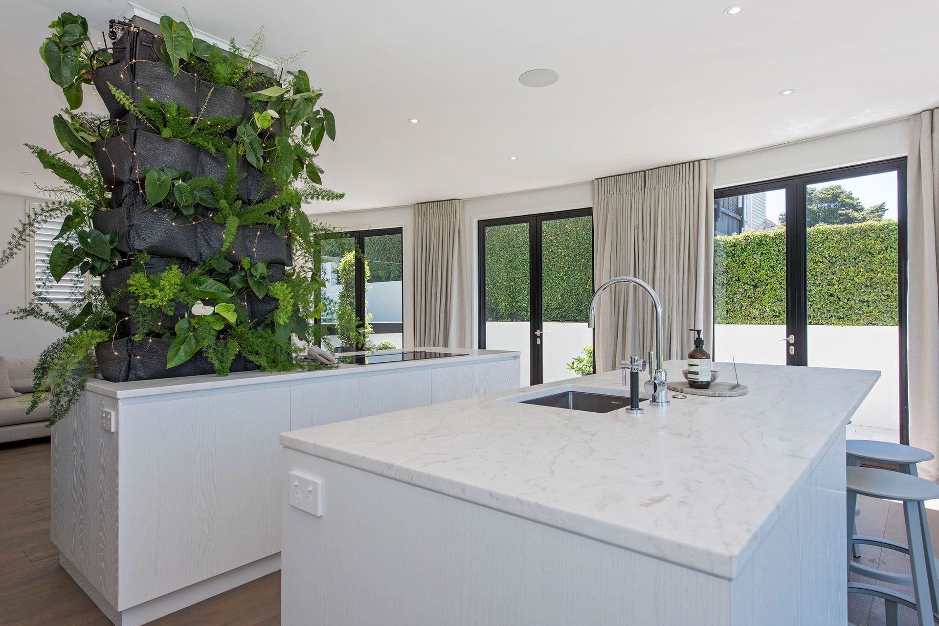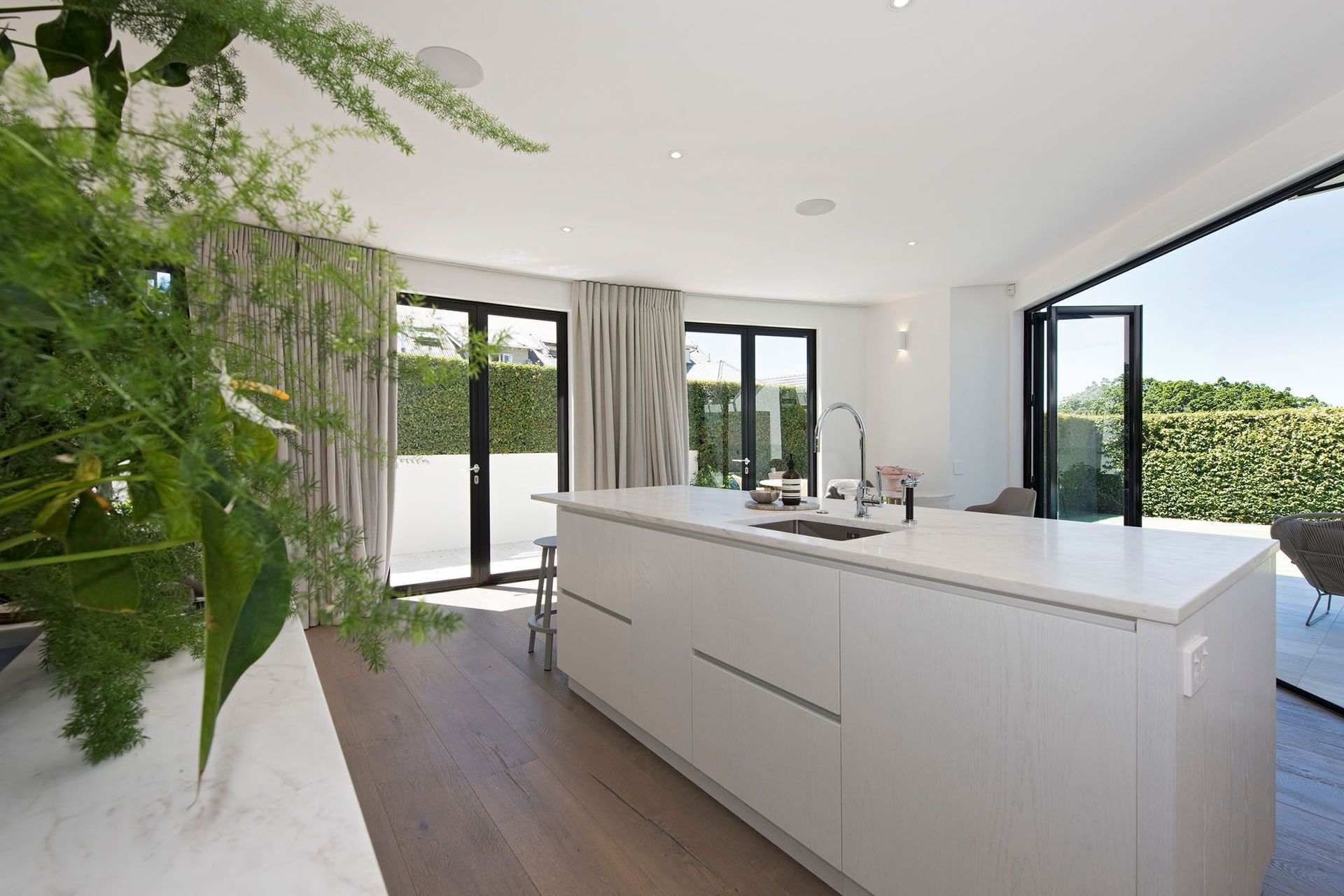 ArchiPro Project Summary - The Remuera Masonry project highlights modern design with elegant wood flooring, sleek countertops, and inviting furniture, creating a warm atmosphere for gatherings.