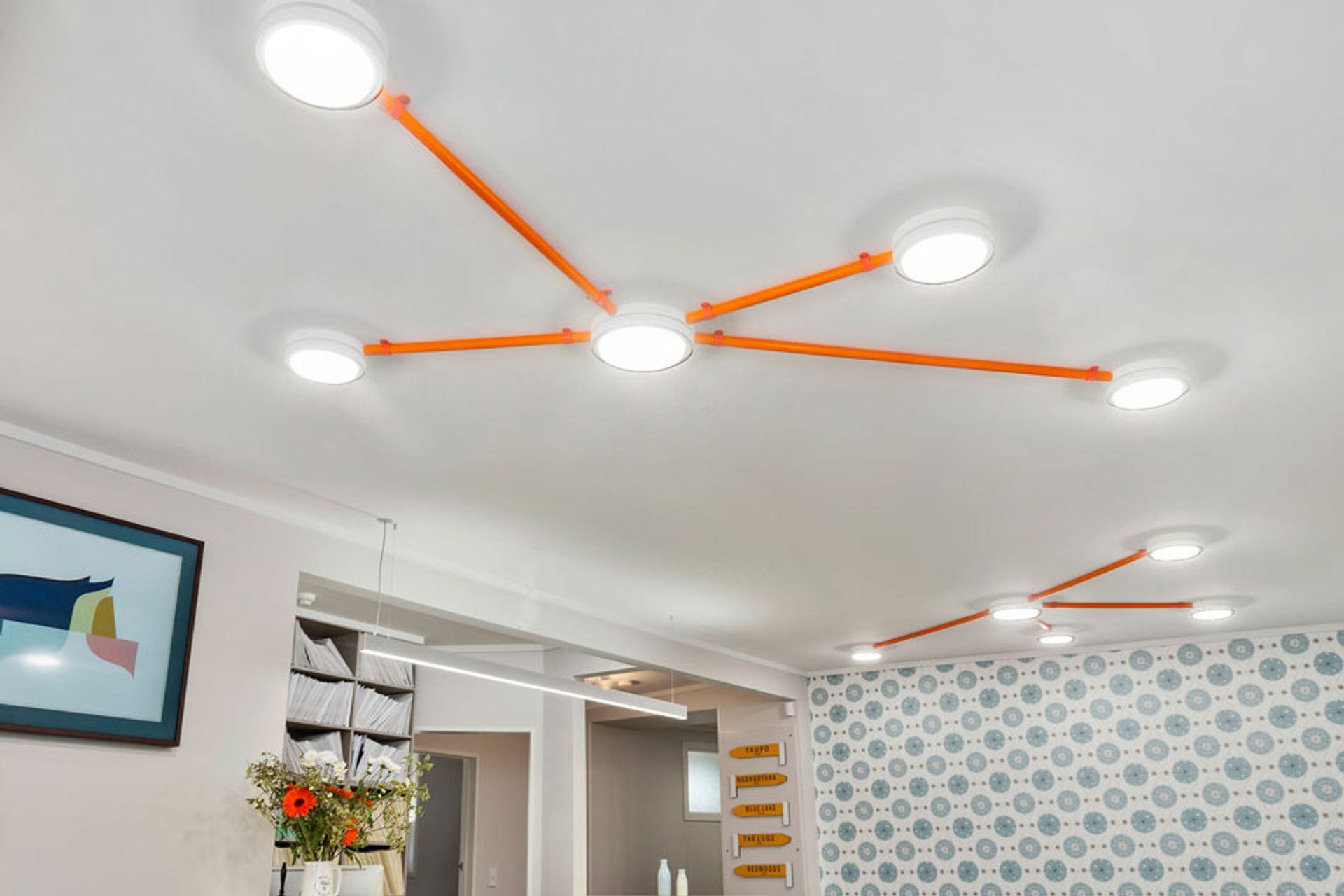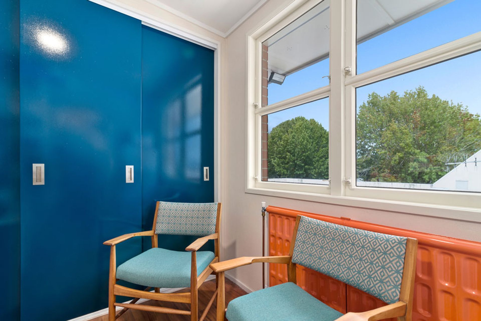 ArchiPro Project Summary - A vibrant modern, retro inspired orthodontic clinic designed for Tony Lund Orthodontist. Work involved updating the reception area and treatment rooms, enhanced lighting, and unique decor elements, completed in 2018 by Marlene Hudson Design.