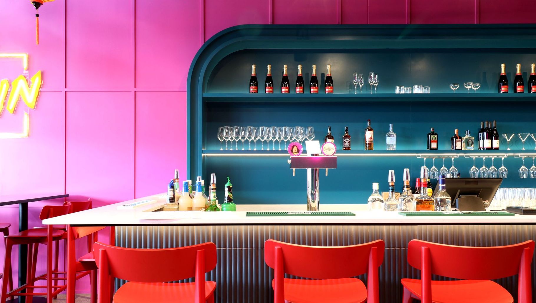 ArchiPro Project Summary - Vibrant cabinetry and bold design elements define the Rhak Kun Restaurant in Takanini, crafted by Fluid Interiors in collaboration with TE&EM Construction Ltd, showcasing innovative curved features and a striking color palette.