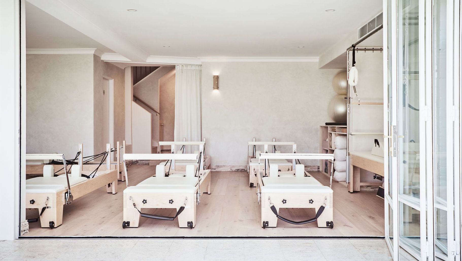 ArchiPro Project Summary - Rise Up Pilates studio designed by Laura Oliveri, featuring calming nude tones, natural stone, rendered walls, and timber floors, creating a serene environment for rejuvenation and inspiration, complemented by a tranquil garden.