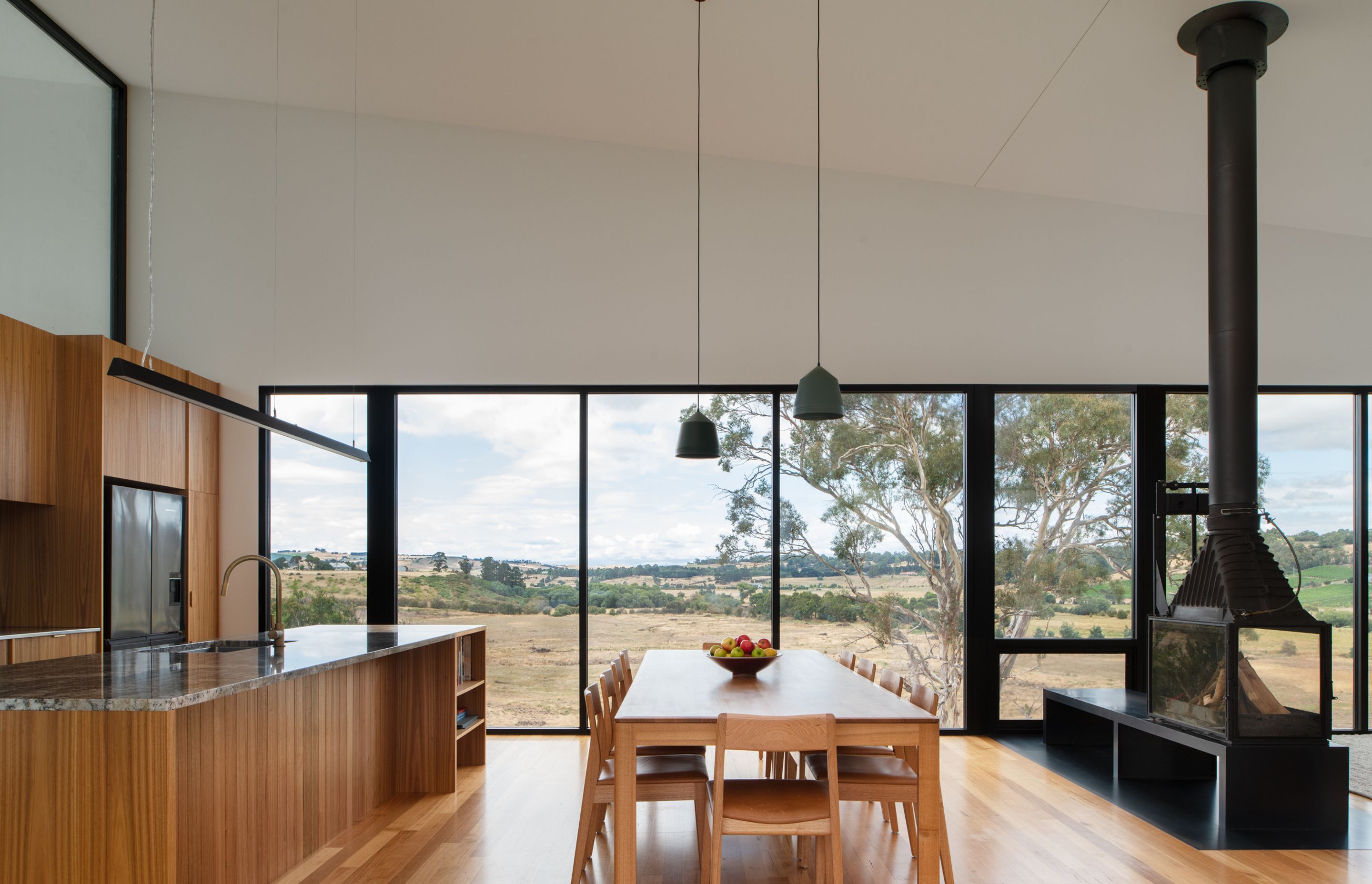 ArchiPro Project Summary - Riverstone is a thoughtfully designed family home in Launceston, featuring a protective courtyard, natural materials, and passive ventilation, harmoniously blending with its stunning semi-rural landscape.