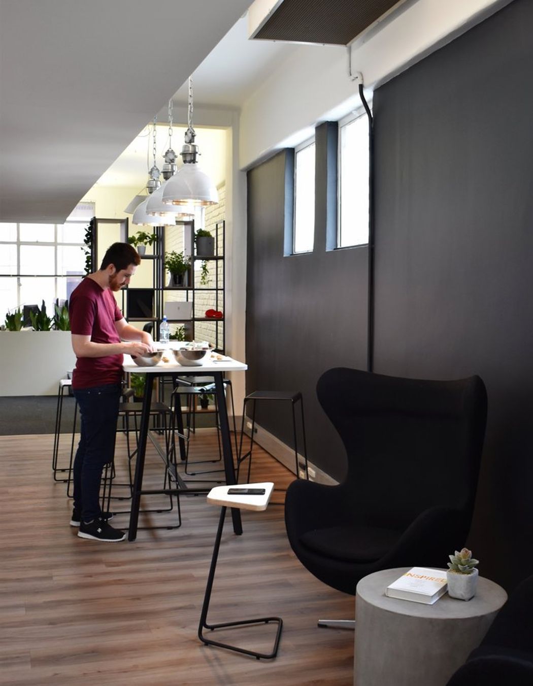 We specified a mix of black wire chairs, beautiful leather look ottomans and simplistic tables with concrete look pillars dotted with plants. The black track lighting hit the monochrome Scandinavian style right on the head, and makes the space much brighter, suitable for task working. People are seen having an impromptu meeting at a free table, others having lunch while they check Instagram. The employees really own the space and are embracing the culture.