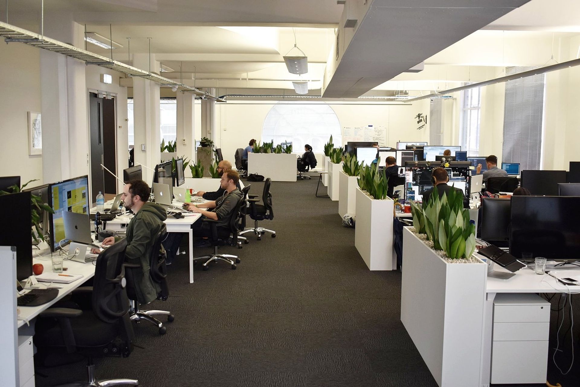 The desk tops and bases were left from the previous tenant and provided a fantastic blank canvas for us to add to. We colour matched the laminate on the desk tops and designed end planter units in the same finish to give each group of desks some distinction between work space and circulation space. The greenery added vibrancy and height variation to this industrial Scandinavian inspired scheme.