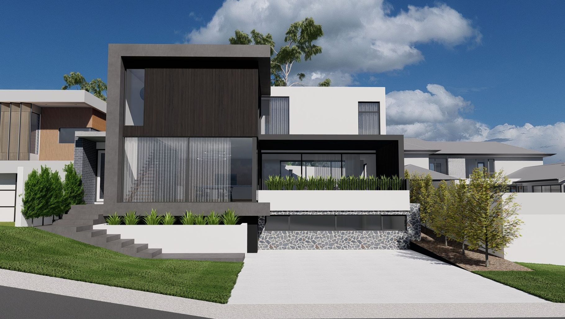 ArchiPro Project Summary - The Roberts Road project features a modern villa that integrates with its residential surroundings, emphasizing durable materials and thoughtful landscaping.
