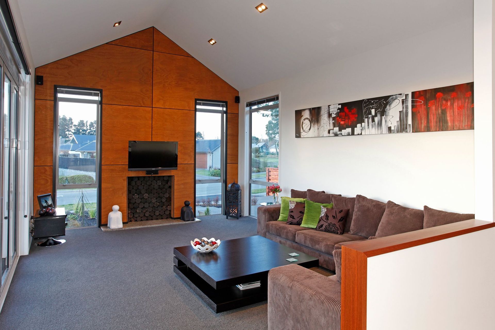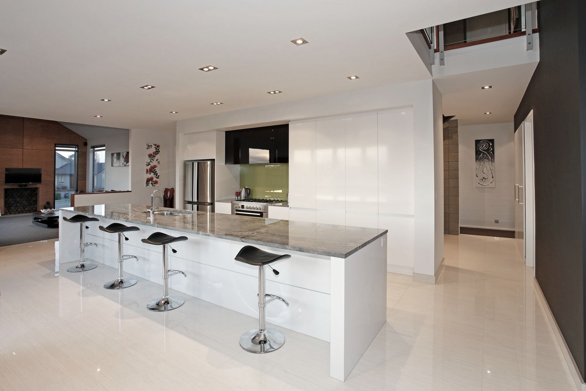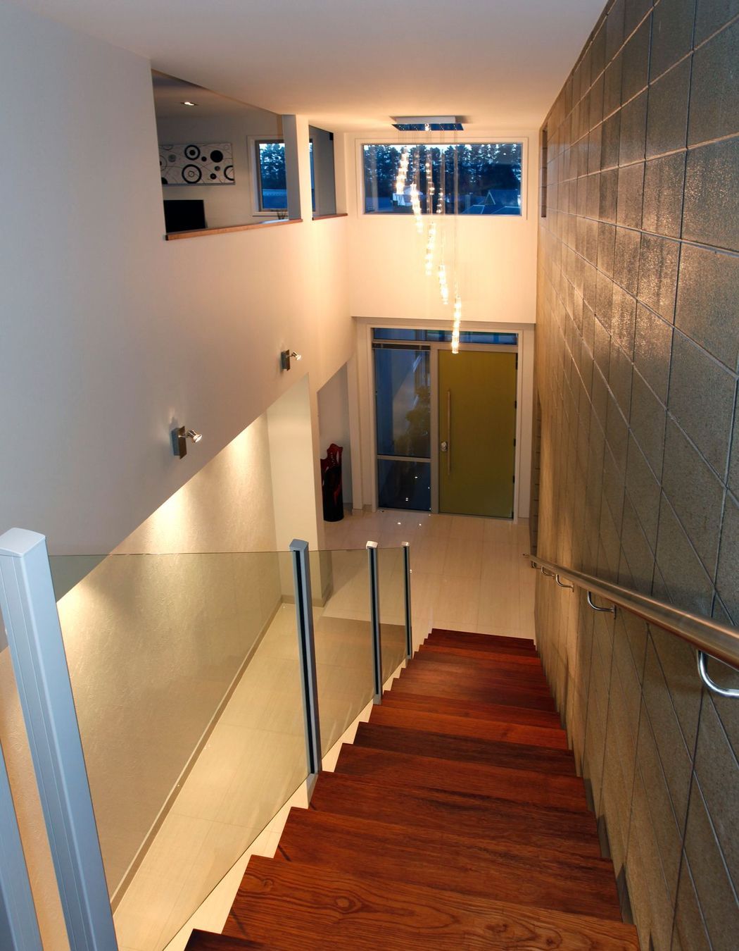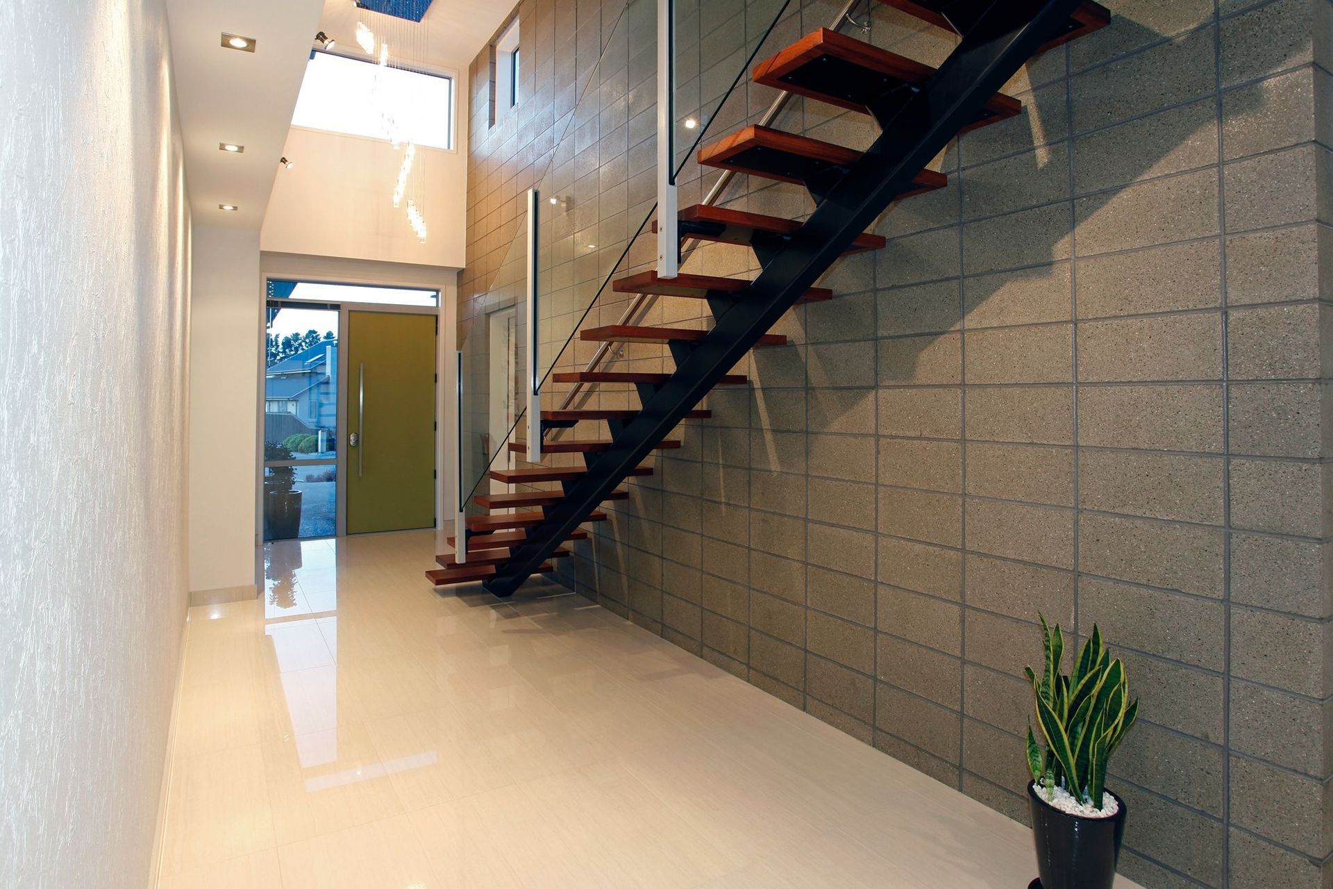 ArchiPro Project Summary - A 300sqm home featuring open spaces and clean lines, enhanced by Celecrete cladding, polished honed concrete blocks, and Western red cedar accents, highlighted by a striking freestanding staircase that creates a stunning entrance.