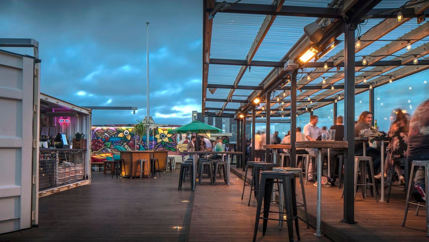 ArchiPro Project Summary - Rooftop bar and eatery featuring stunning views of Wellington harbour, designed with shipping containers and pre-fabricated shelters, offering tiered seating and a vibrant summer atmosphere on the historic Hope Gibbons building.