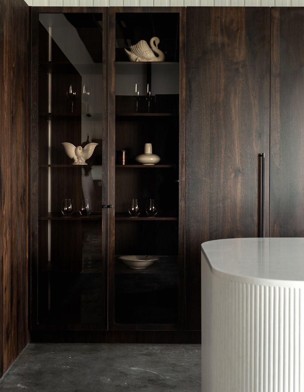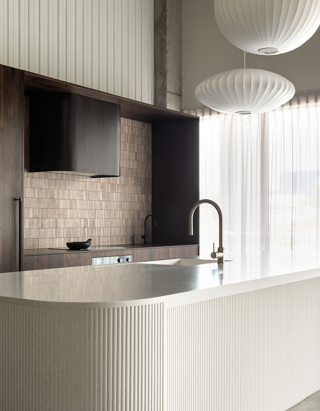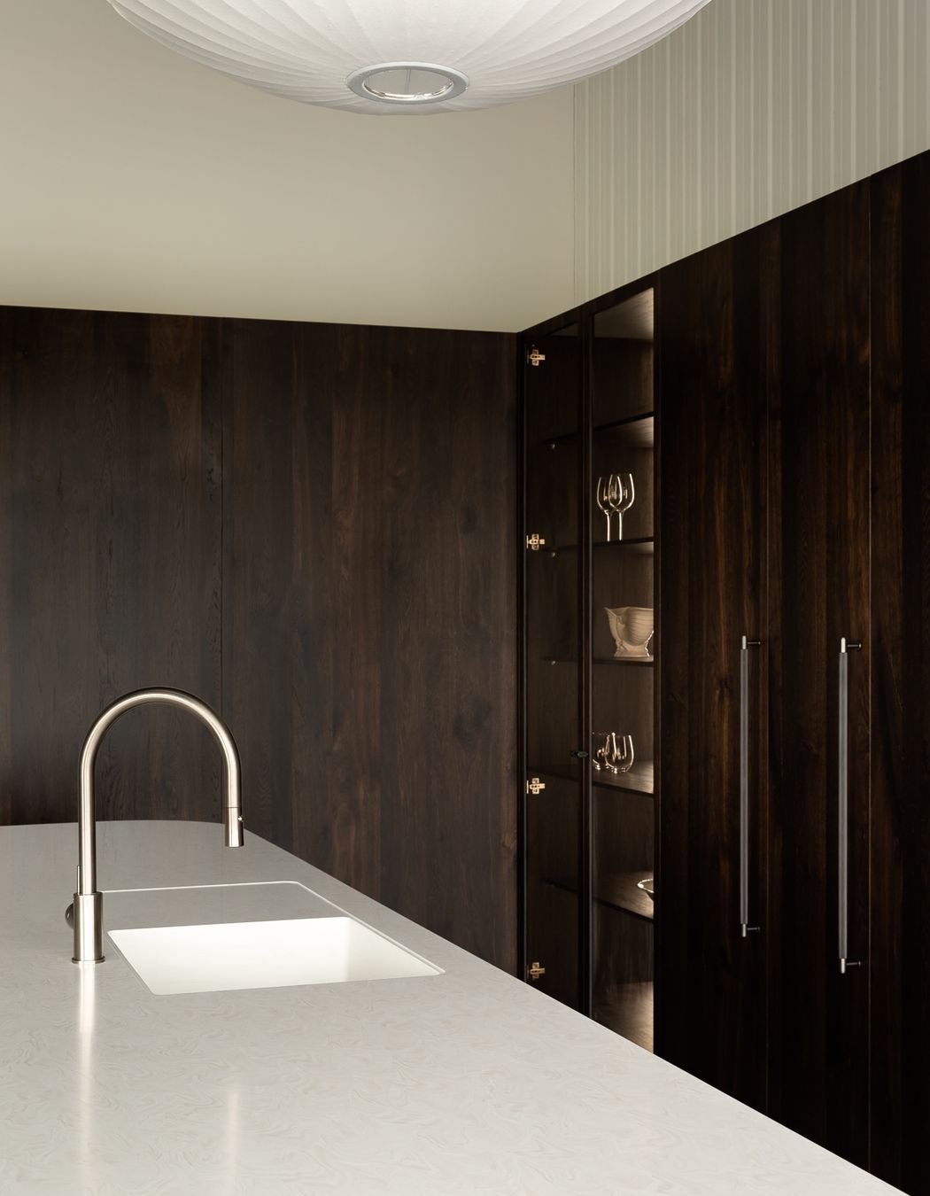 ArchiPro Project Summary - A stunning showcase of Beam Smoked Oak veneer in Rowson Kitchen, blending elegance and texture with a timeless neutral palette, complemented by durable travertine, reflecting a shift towards characterful kitchen designs.