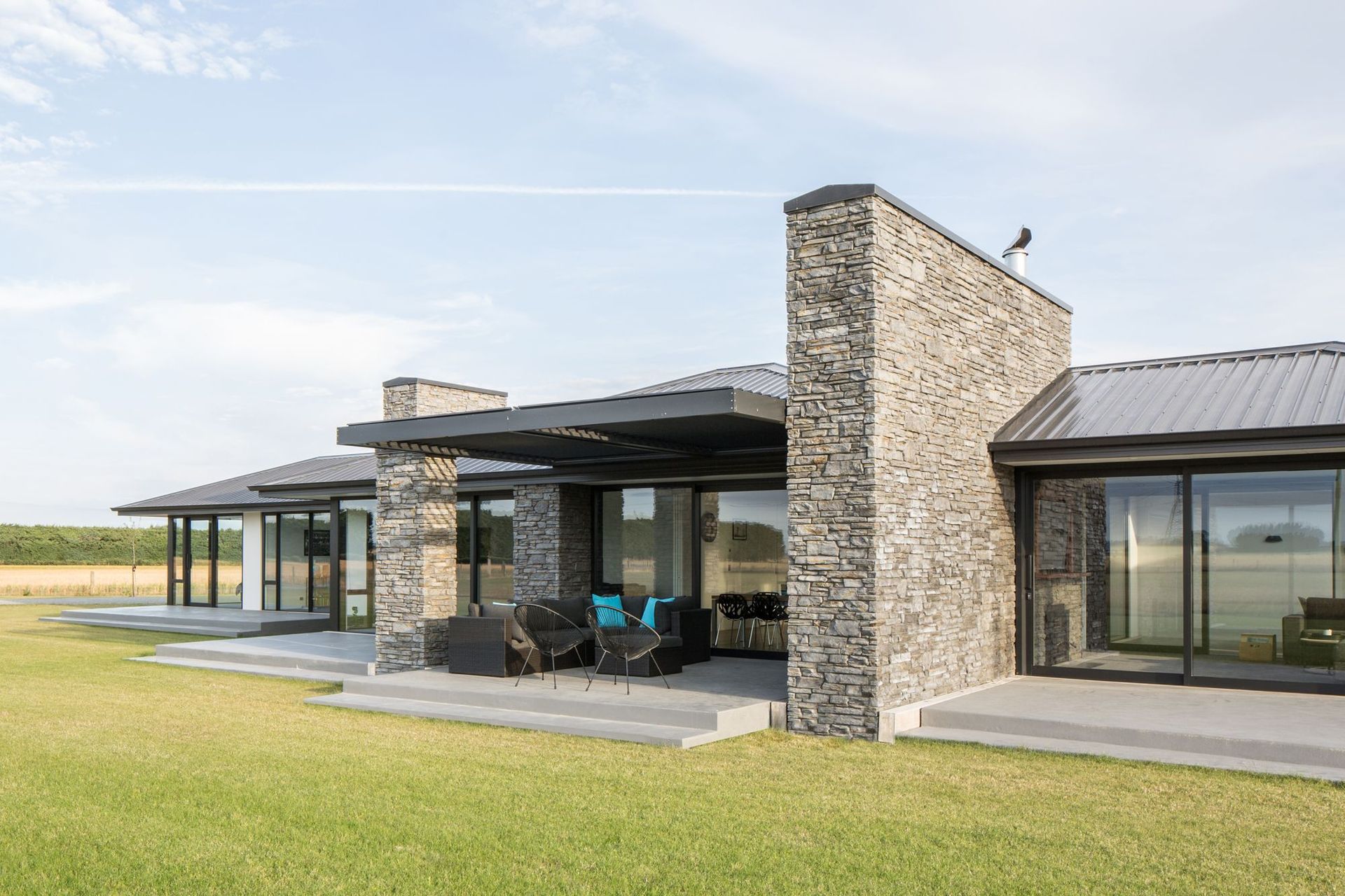 ArchiPro Project Summary - A warm family home featuring distinct wings, extensive glass use for outdoor connection, and versatile courtyard spaces, anchored by a striking stone wall that seamlessly integrates interior and exterior living.