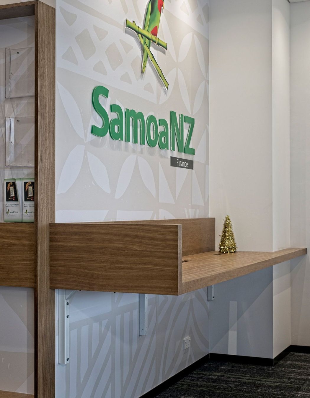 ArchiPro Project Summary - Joinery installation for Samoa NZ bank in Manukau, featuring curved veneer counters, timber wall features, and a staff kitchenette, all crafted in collaboration with a local architect to bring an innovative design to life.
