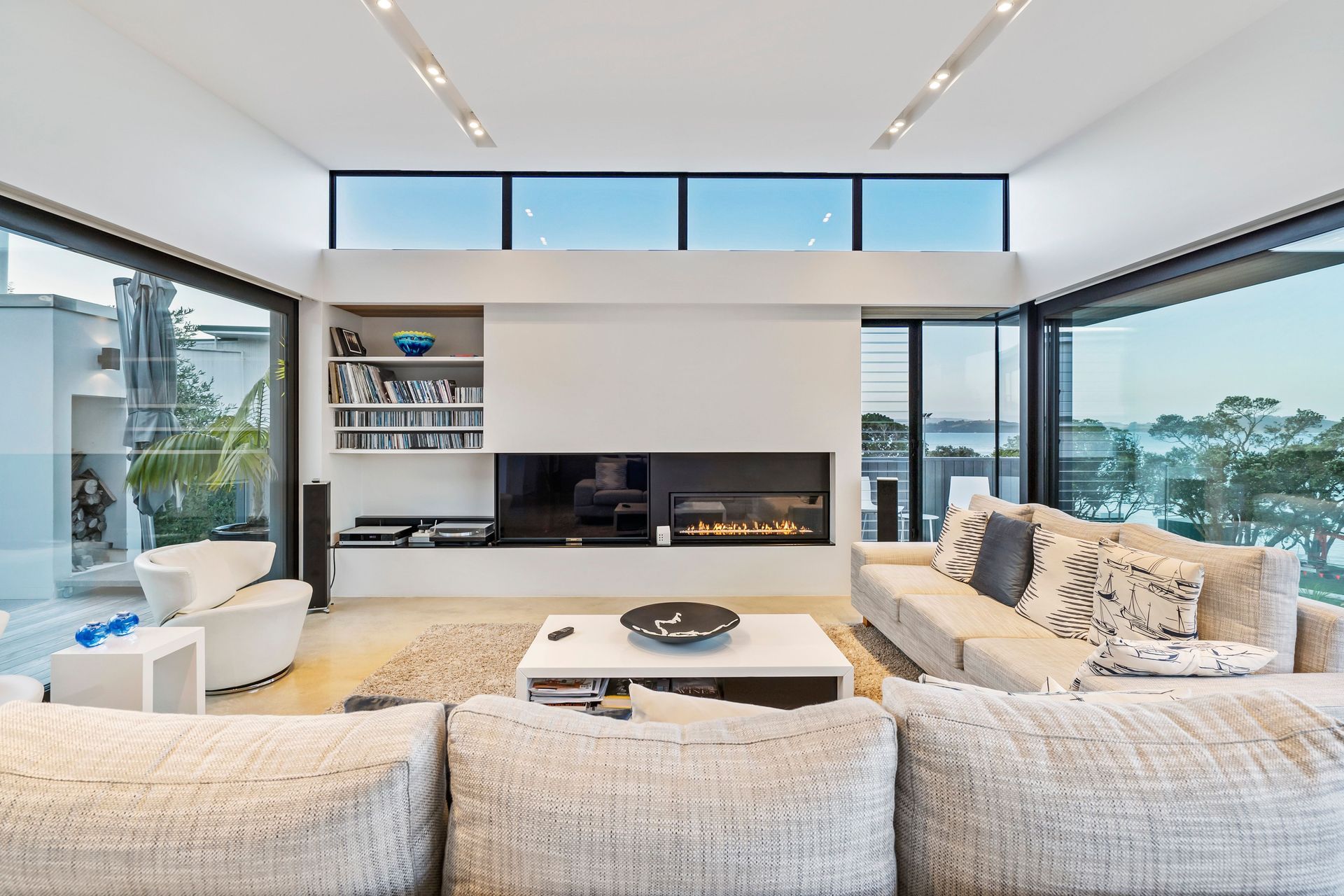 Links between outside and in are brought through in this room with a feature wall crafted of the same cedar cladding that has been used on the exterior, while a low rectangular feature window offers enticing glimpses of the bay from the comfort of the couch.