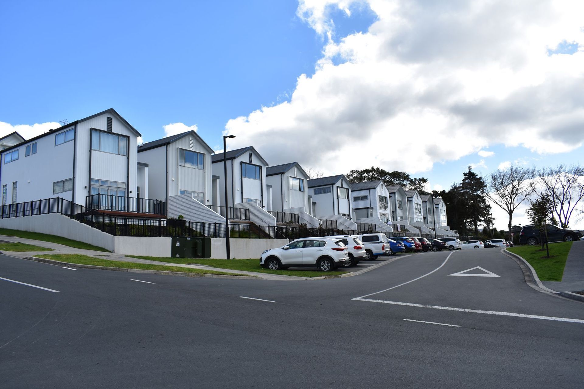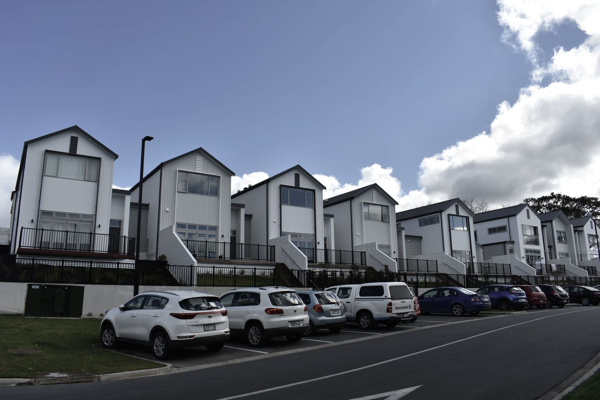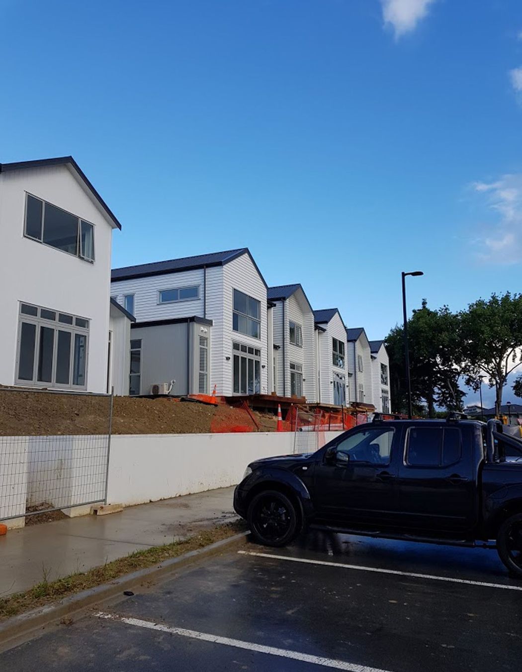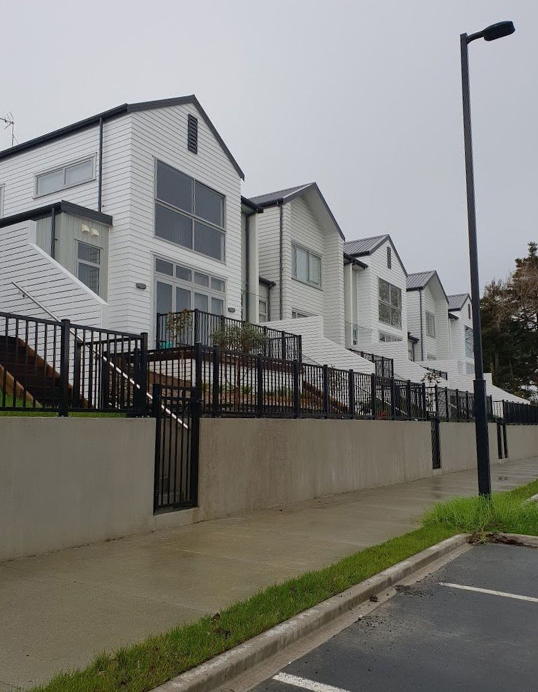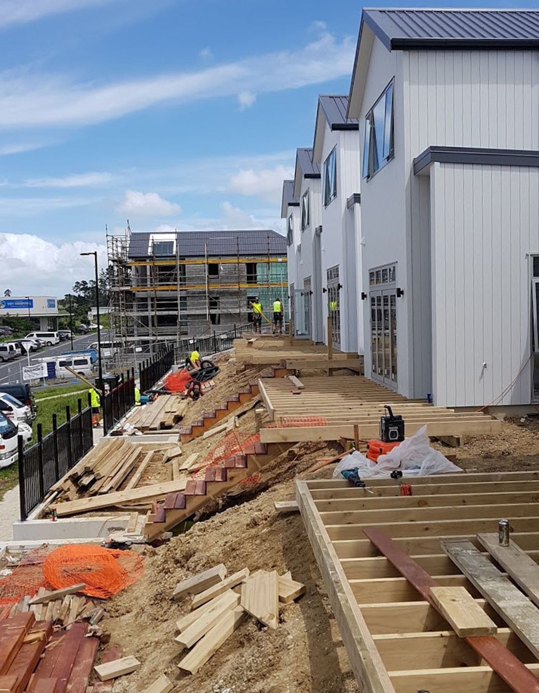 ArchiPro Project Summary - Comprehensive exterior works for a 10 townhouse development in Millwater, featuring 85 SED piles, extensive framing and kwila decking, custom-built stairs, privacy fencing, and deck enclosures.