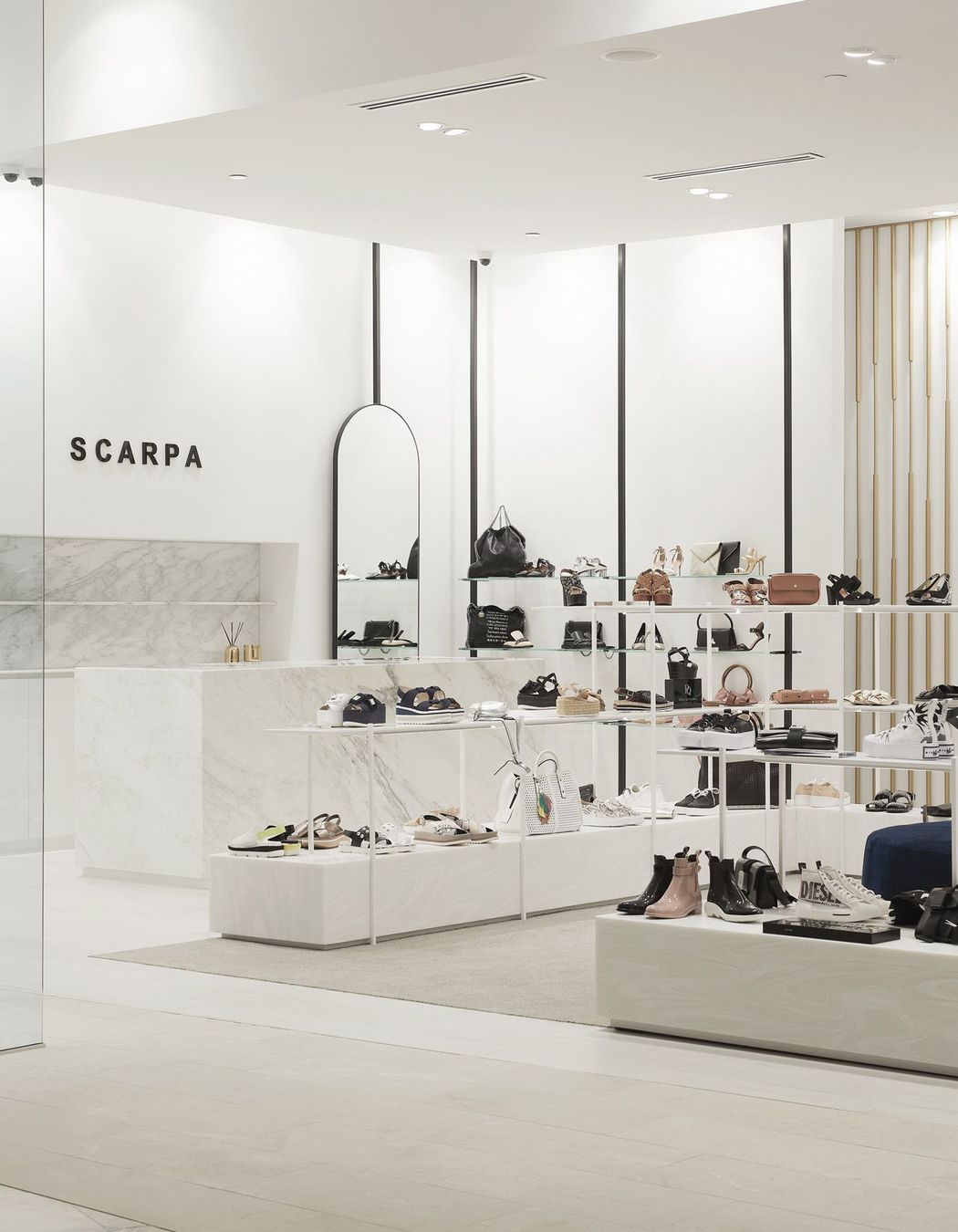 ArchiPro Project Summary - Scarpa Westfield Newmarket features a sophisticated rebranding with a classic black and white logo, complemented by an interior design that incorporates subtle textures, whites, greys, and brass accents, enhancing the display of European shoes and handbags.