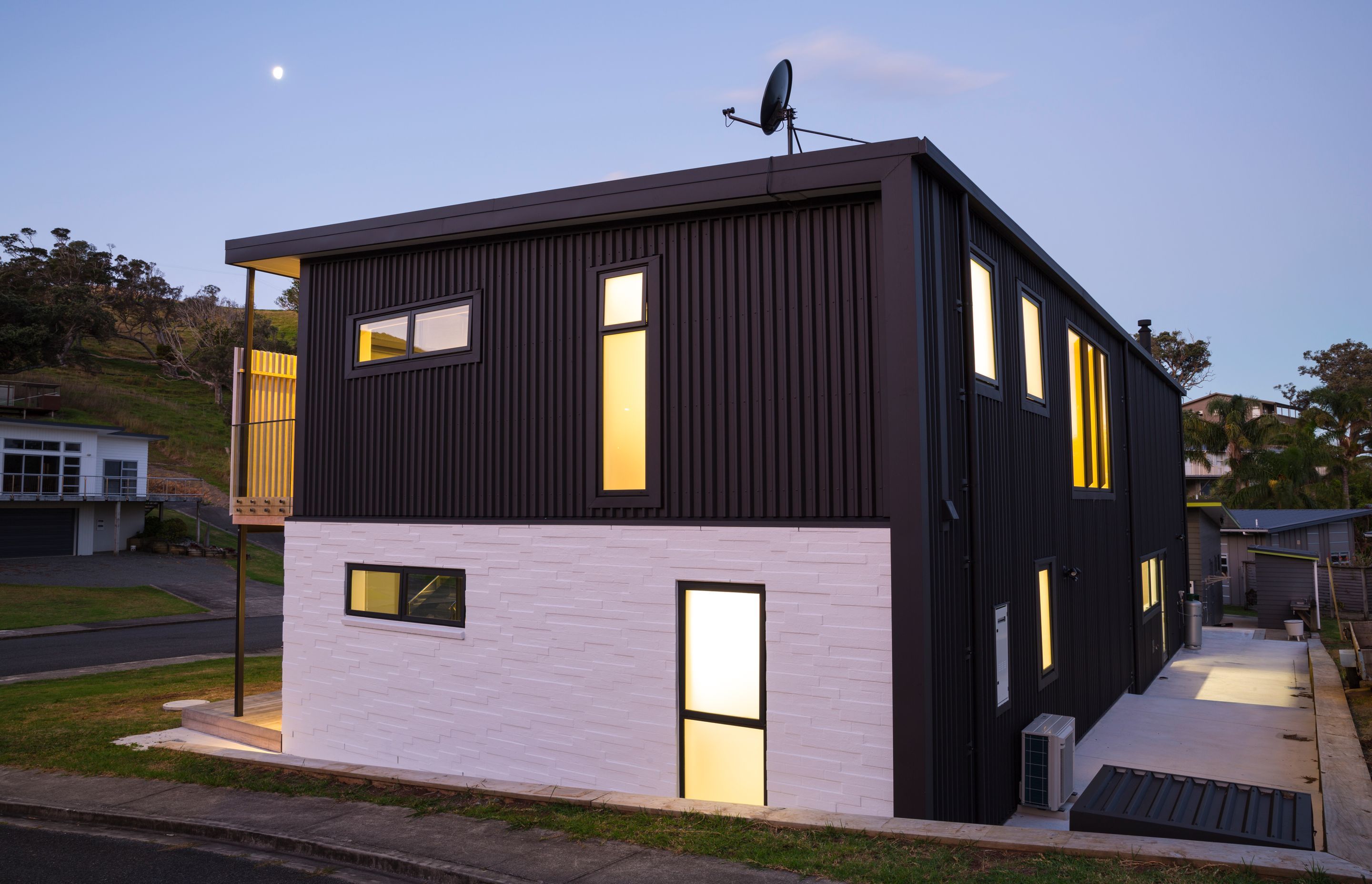 ArchiPro Project Summary - A modern beach house designed for a family of four, featuring innovative privacy solutions and sustainable materials, completed in 2023 in Oakura, Whangarei District.
