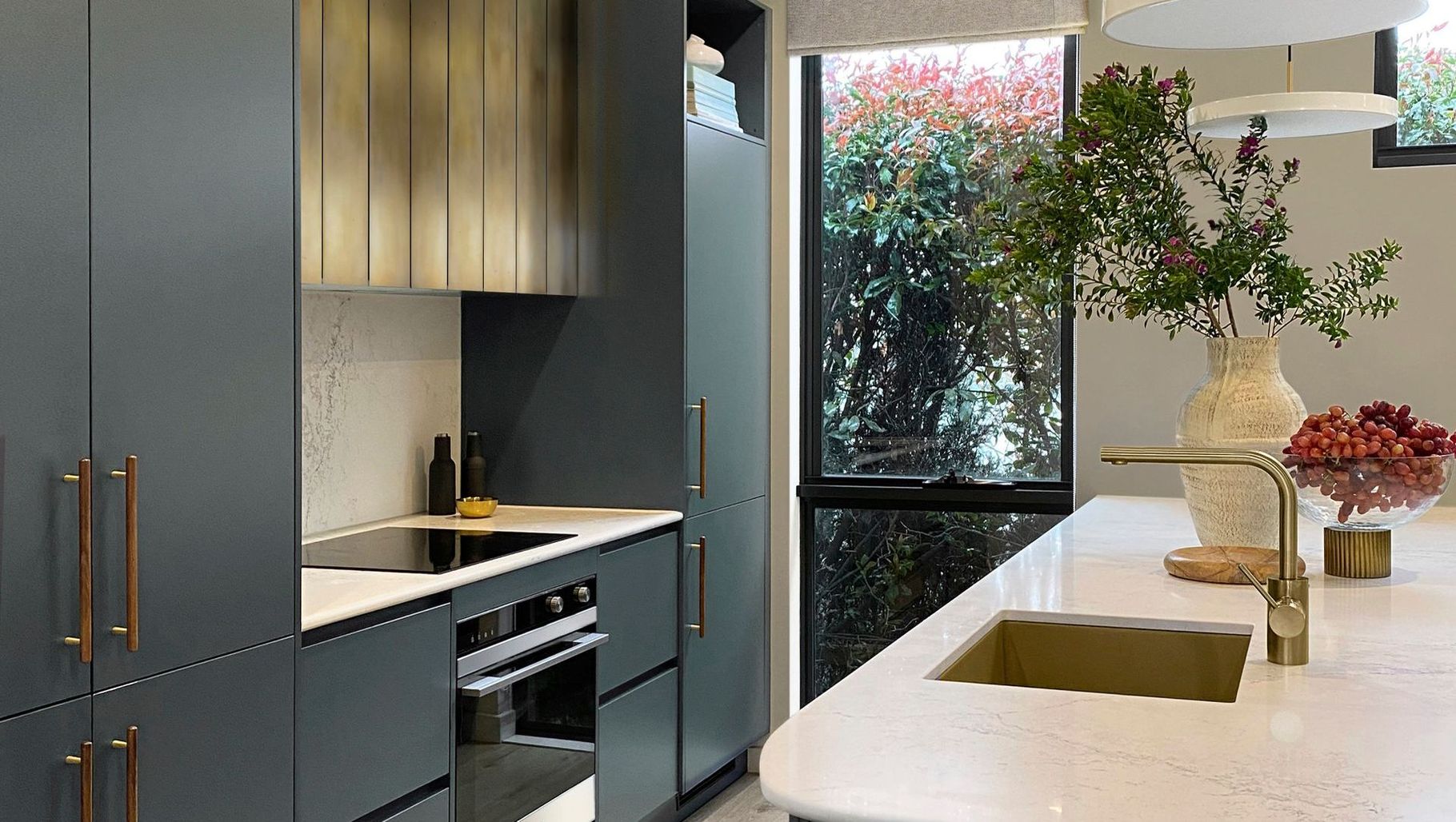 ArchiPro Project Summary - A modern beachfront retreat in Mornington Peninsula, featuring exquisite craftsmanship, striking seaside-blue kitchen cabinets, oxidised brass accents, and a cozy fireplace bench for relaxation.