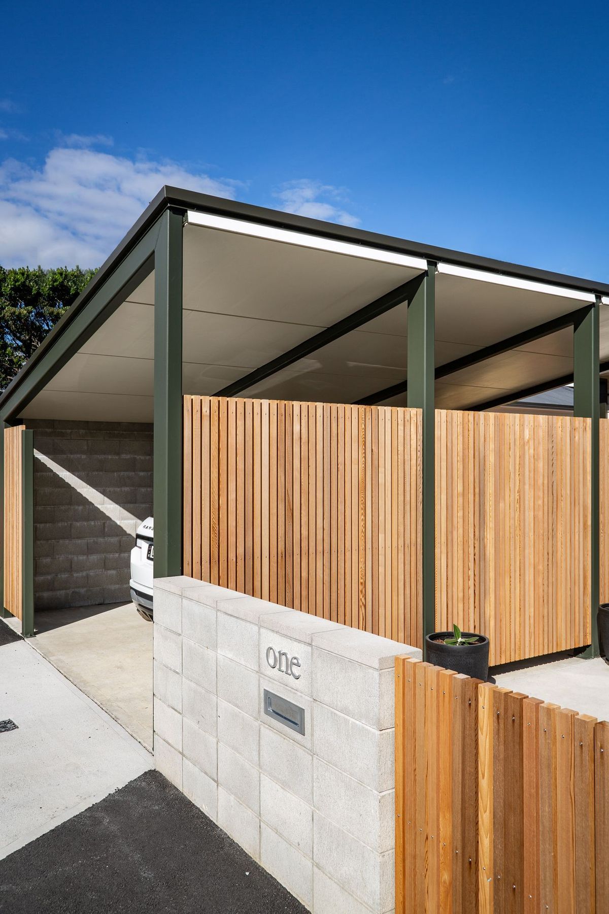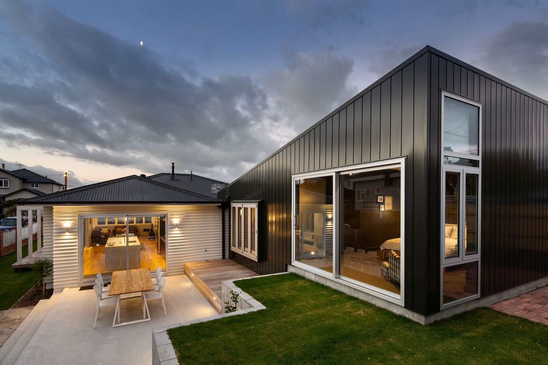 ArchiPro Project Summary - A stunning transformation of a former military home featuring a complete renovation with modern design elements, including a new extension clad in aluminium panels and a striking carport with steel structure and cedar slats.