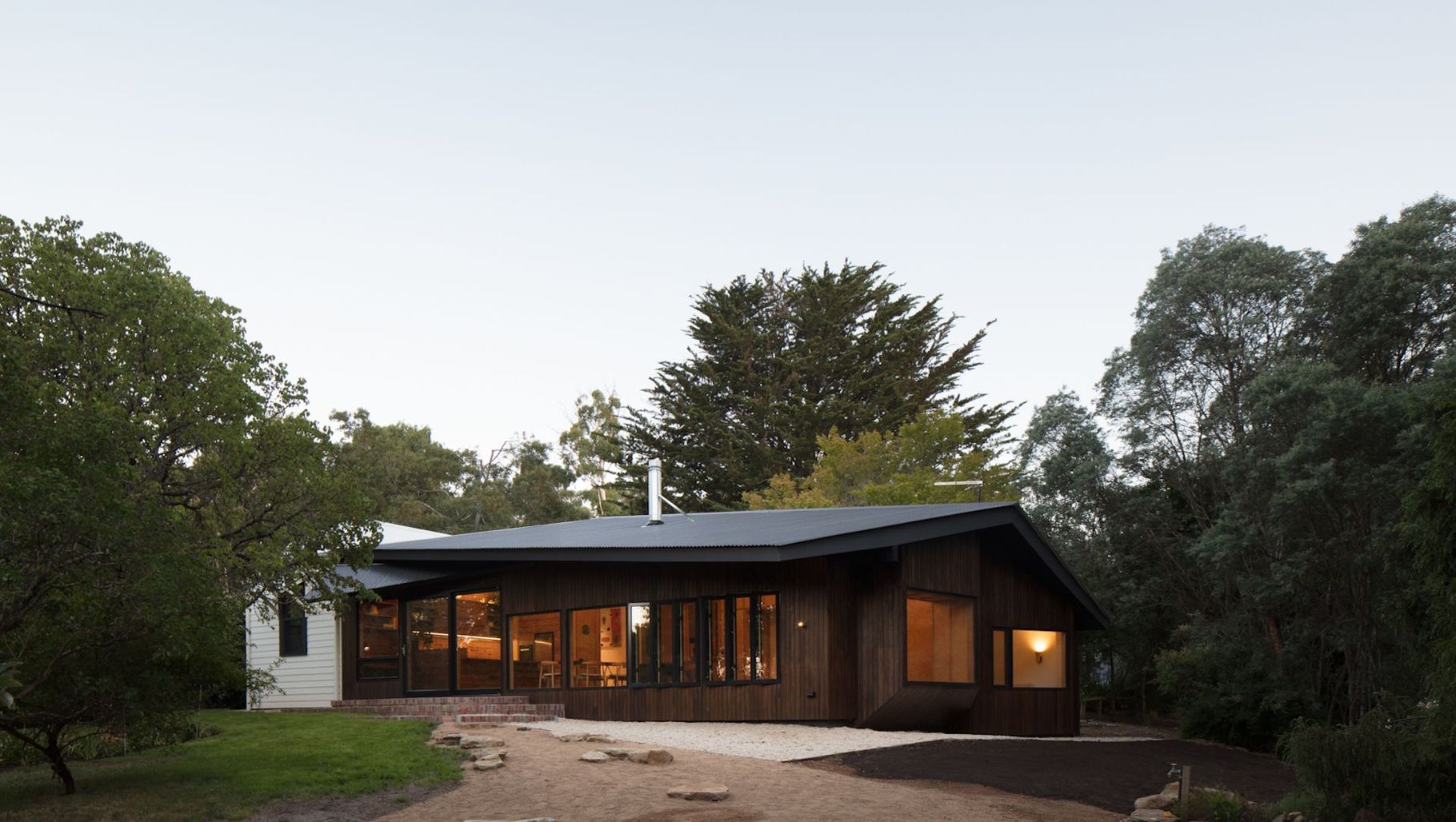ArchiPro Project Summary - Shadow Cottage harmoniously integrates with its natural surroundings, featuring a reconstructed Victorian worker's cottage, stained timber cladding, and north-facing glazing for passive heating, all while offering stunning views of the adjacent nature reserve.