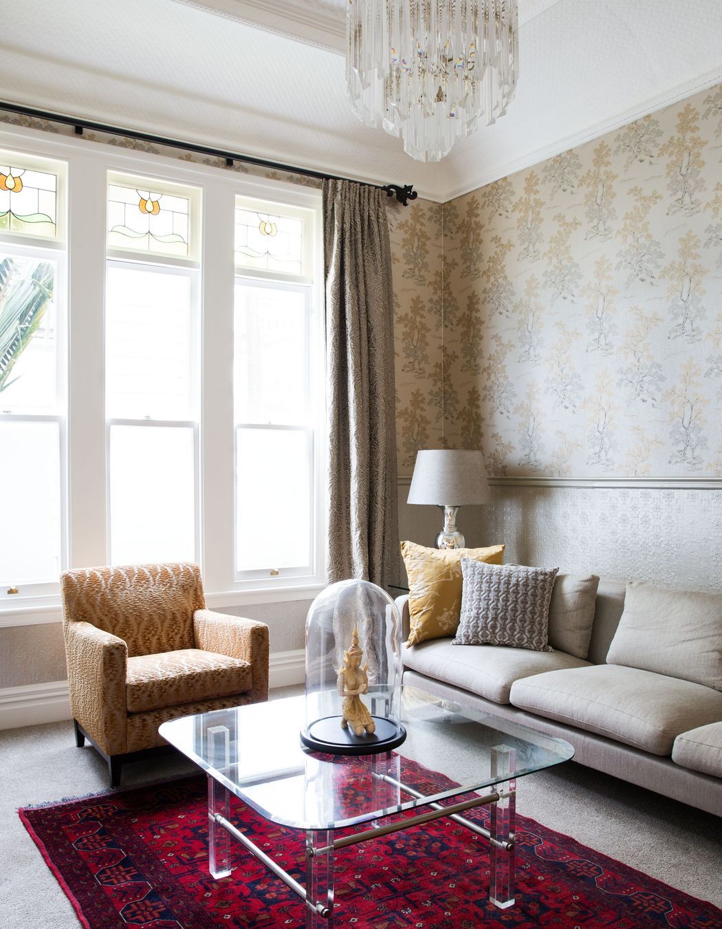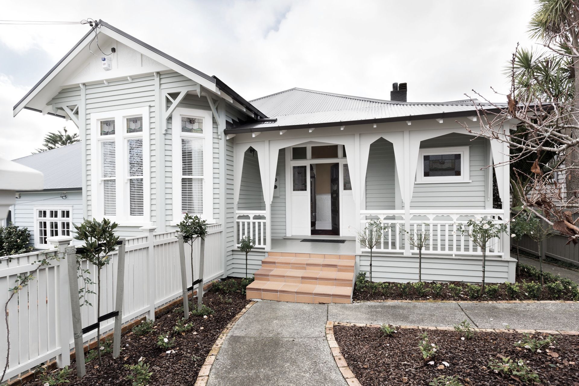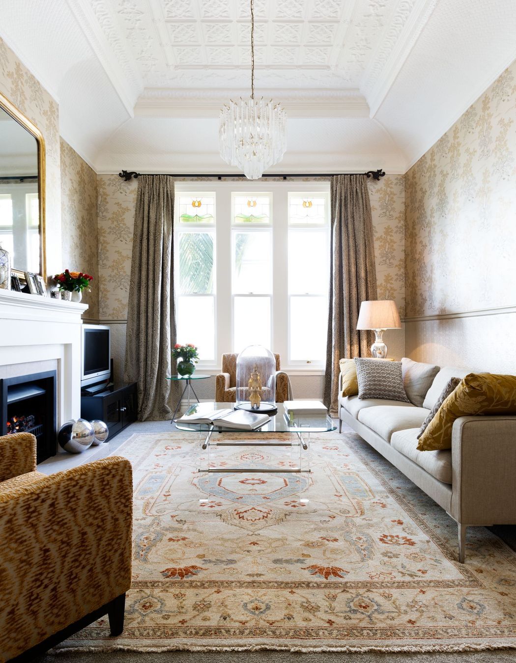ArchiPro Project Summary - A finalist in the 2014 NZ House & Garden Room of the Year award, this villa features a warm entry hall, ornate ceilings, luxurious living room design, and a harmonious blend of textures and colors throughout, including a soft green exterior and updated gas fireplace.
