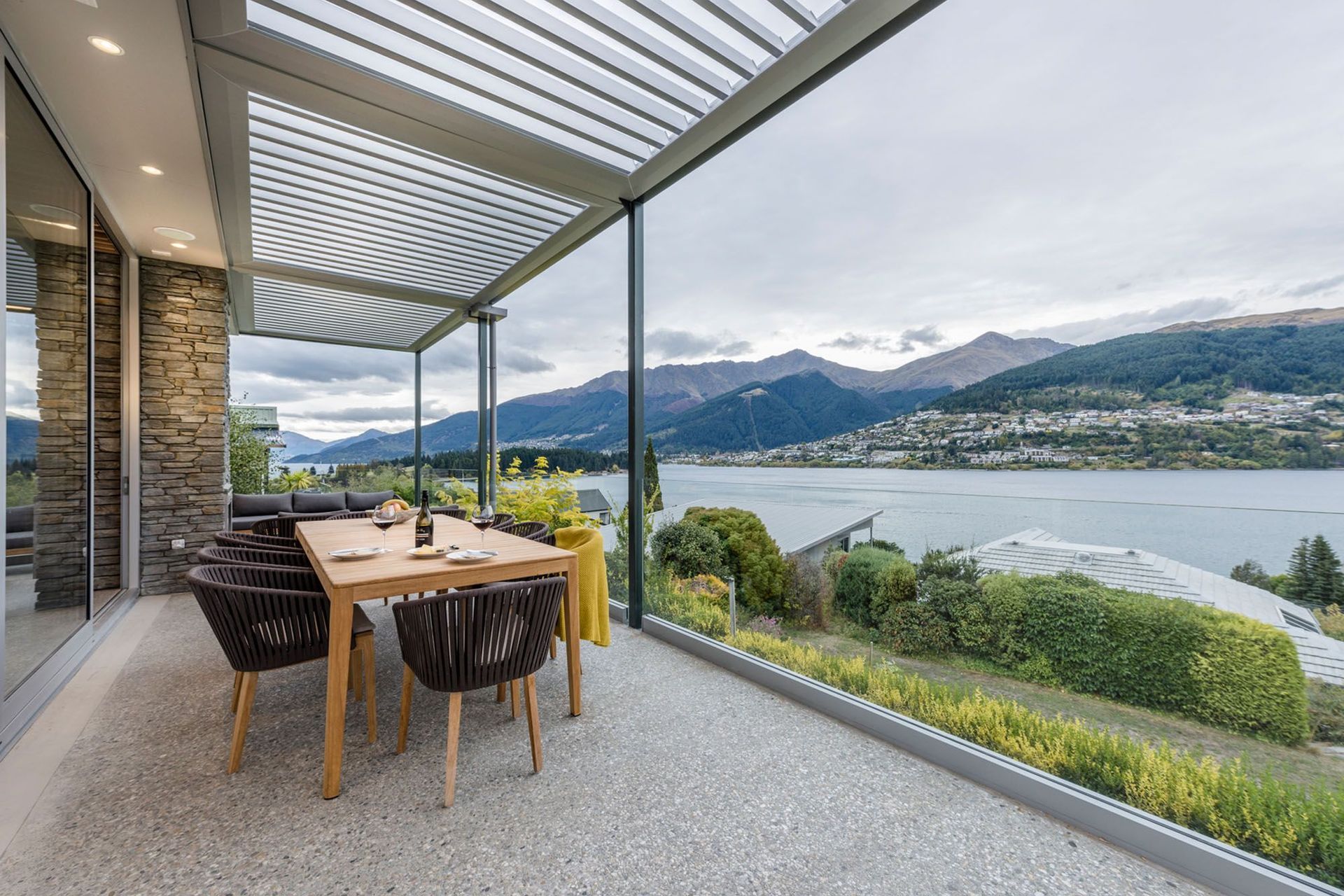 ArchiPro Project Summary - A stunning transformation of an outdated 80's house in Kelvin Heights, featuring an open plan living area and breathtaking views of Lake Wakatipu and the Remarkables, anchored by two stone towers and enhanced by innovative design elements.