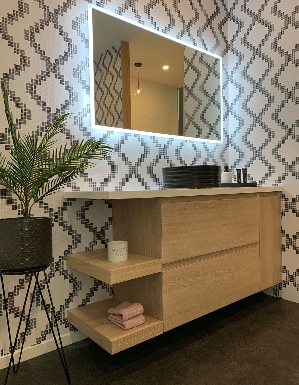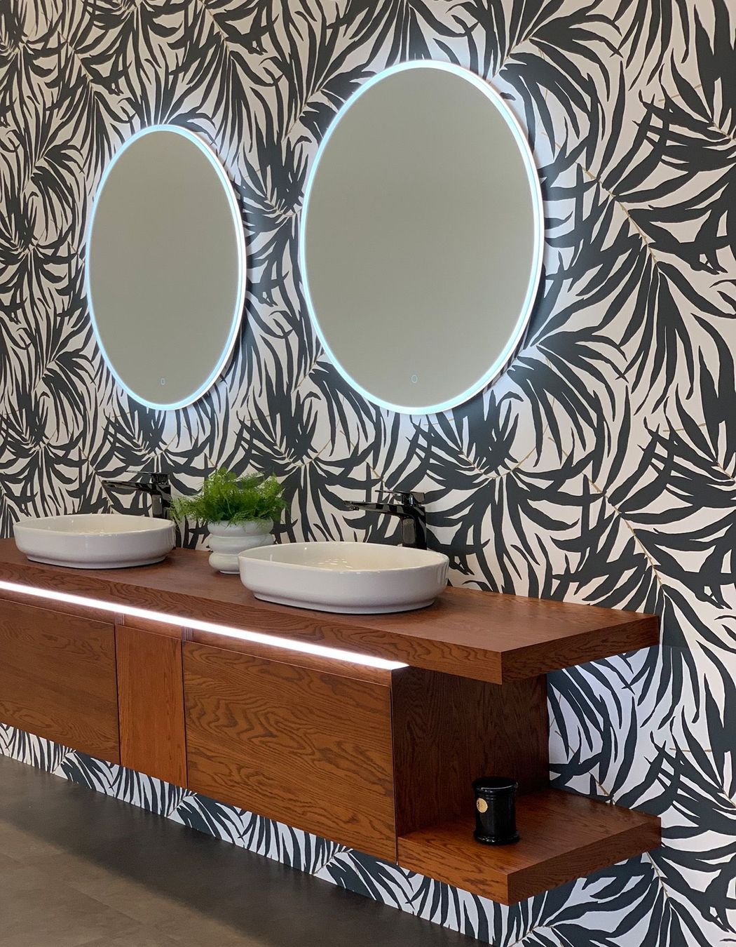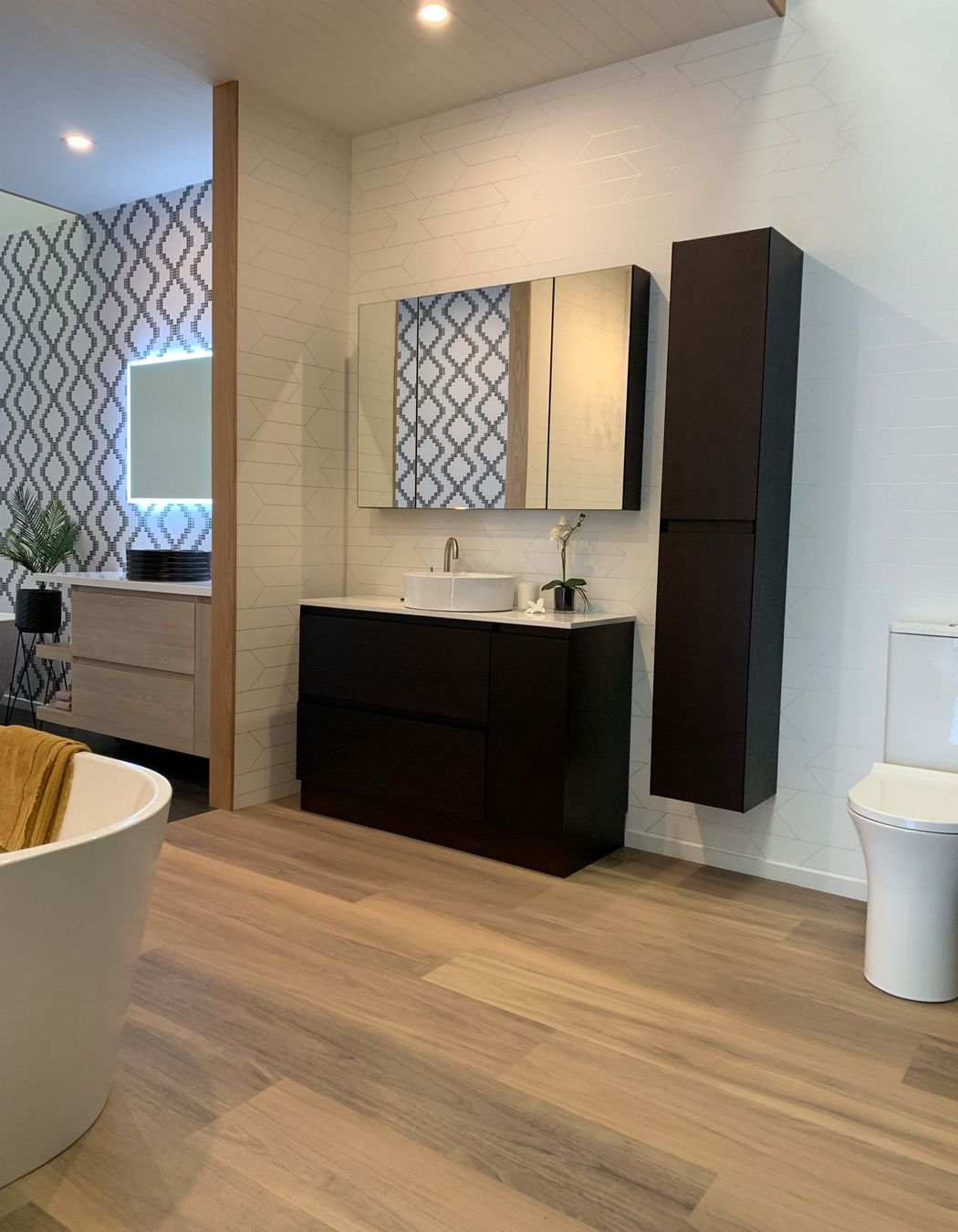 ArchiPro Project Summary - A modern showroom bathroom design that combines functionality and aesthetics with innovative storage solutions and elegant finishes.