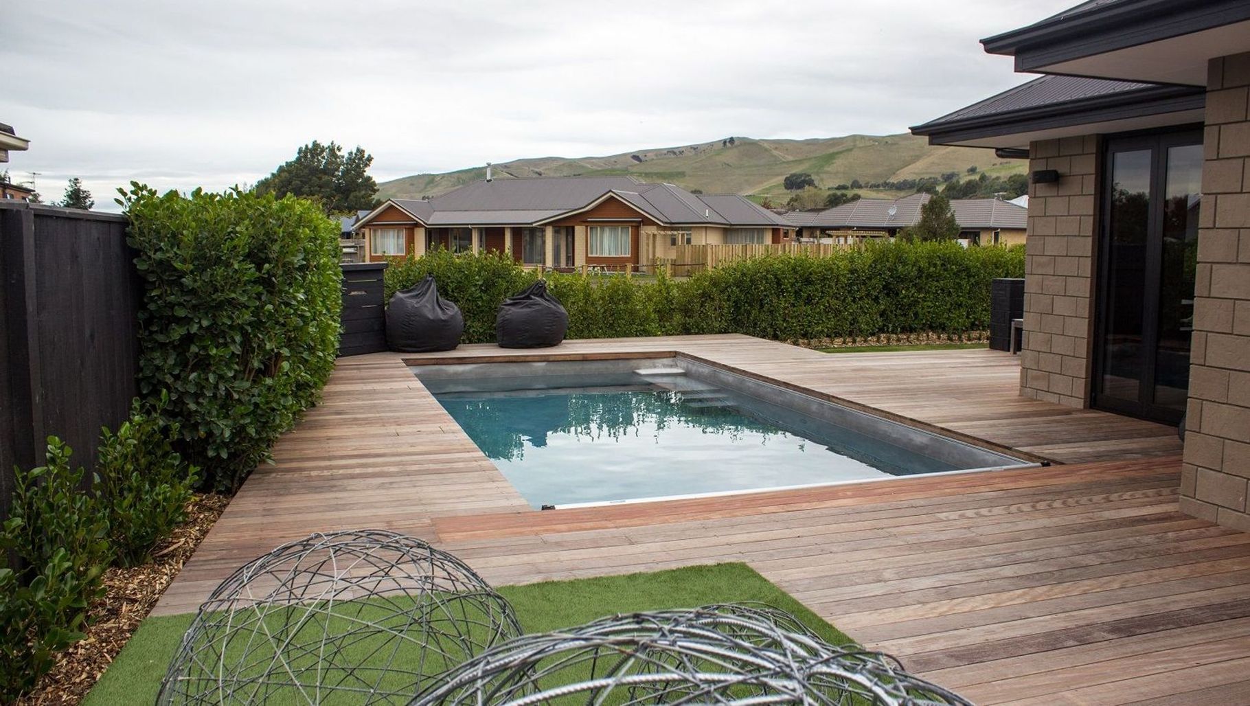 ArchiPro Project Summary - A harmonious outdoor space featuring low-maintenance landscaping, seamless hardwood decking, and a beautifully integrated pool, all set against the stunning backdrop of the Wither Hills.