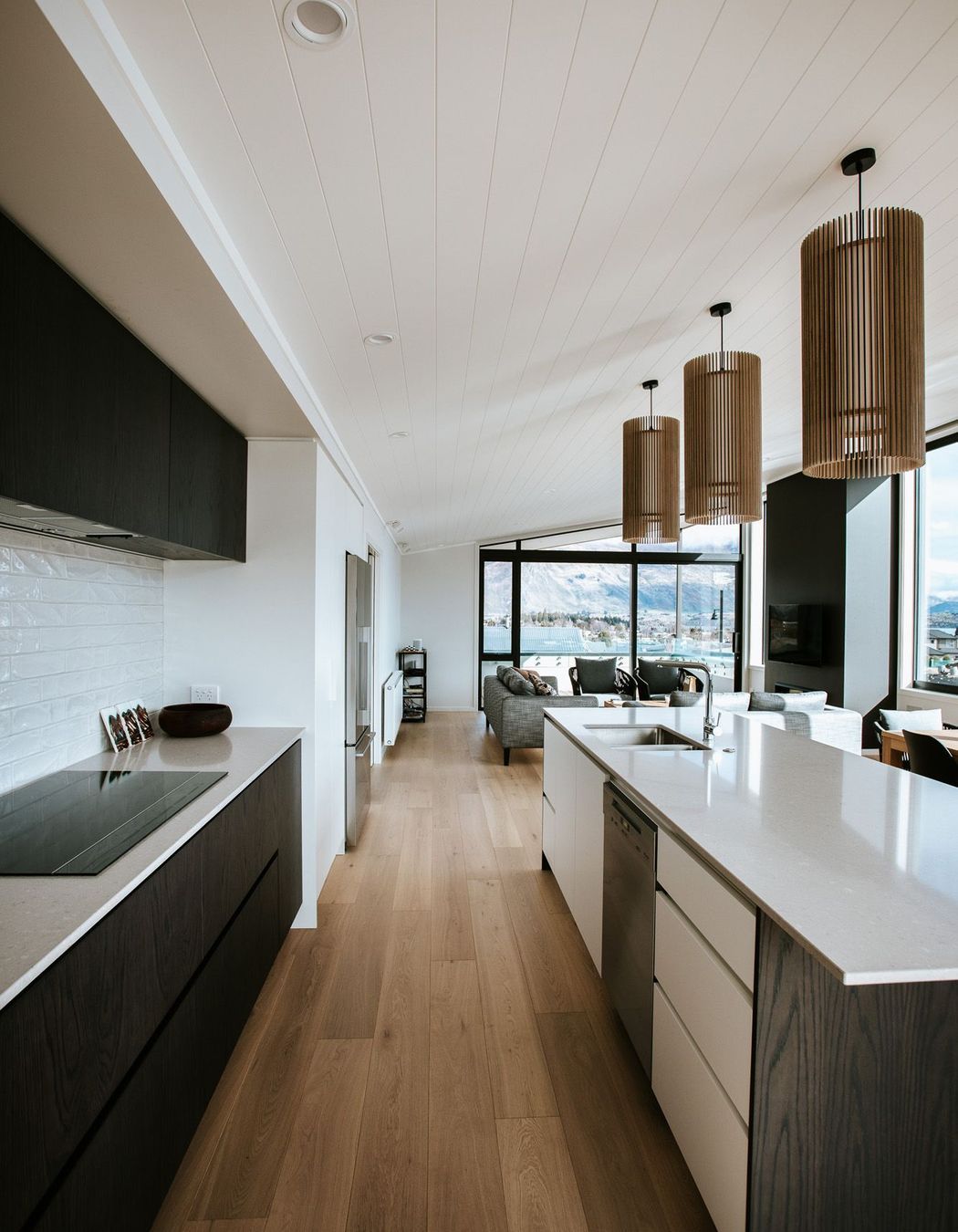 ArchiPro Project Summary - A stunning modern kitchen featuring dark veneer cabinetry, sleek white surfaces, hidden handles, and a built-in overhead rangehood, complemented by glossy subway tiles, timber flooring, and wooden pendant lighting for a warm, inviting atmosphere.