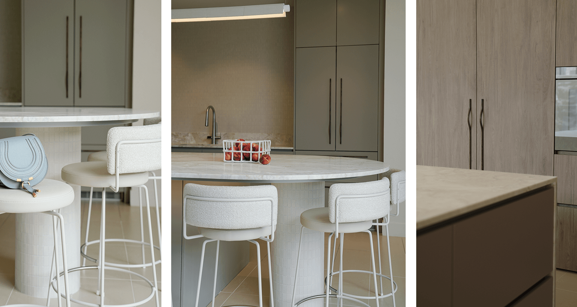 ArchiPro Project Summary - A stunning kitchen in Sorrento, showcasing the beauty of American Oak and inspired by the natural hues of the Australian bushland, featuring elegant marble benchtops, a tiled breakfast bar, and stylish Ebony Stained Timber Chicama Thin Handles.